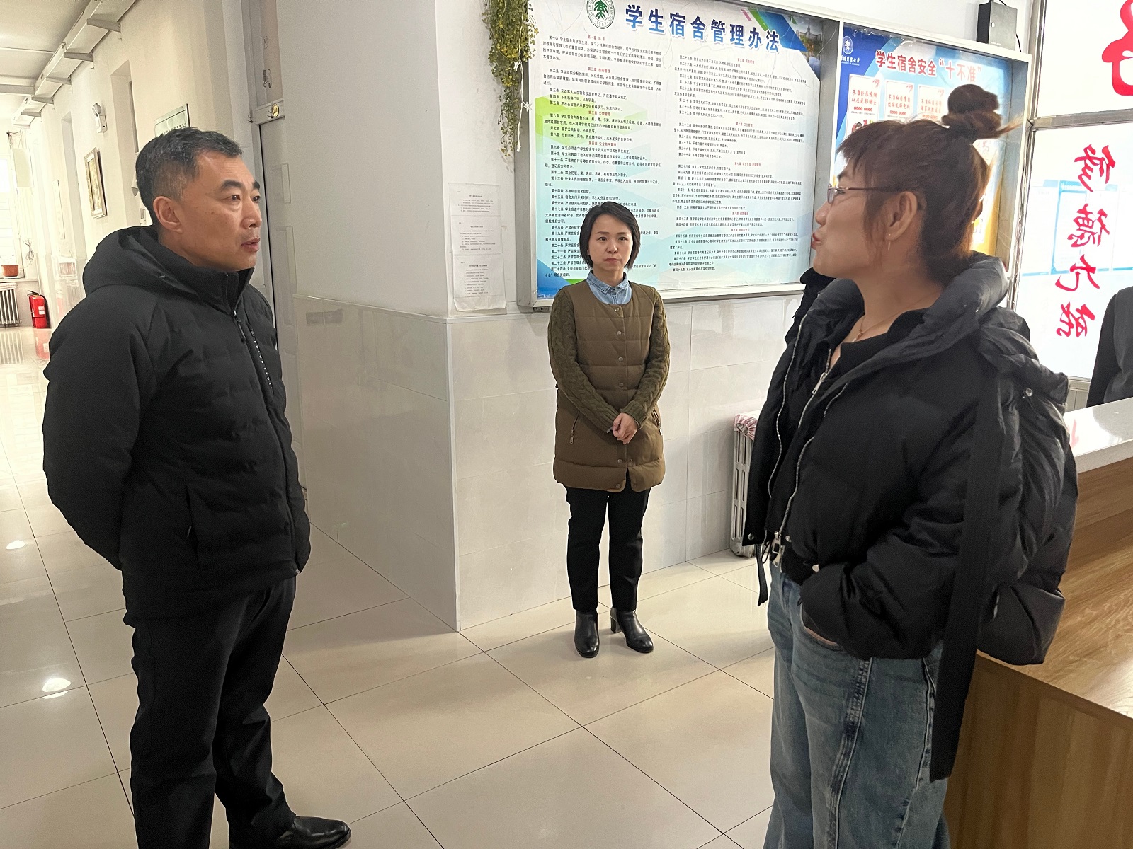 姜国峰带领第一组先后来到北校区A区部分学生公寓和南校区各学生公寓,检查楼宇及周边积雪清理情况,了解学生返校住宿基本情况,查看生活用水、用电及寝室内暖气供应状况,查看公共区域和寝室内卫生状况,询问学生公寓管理服务工作中存在的问题,排查安全风险隐患,现场推进解决重点难点问题。