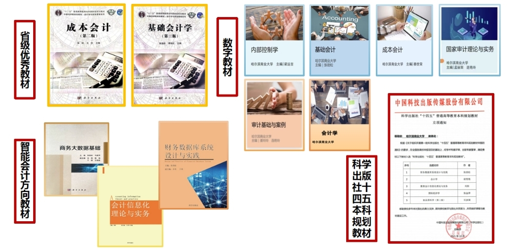 为匹配线上线下混合课程建设、减少出版周期导致的知识滞后,学院已形成数字教材与实体教材相支撑、数智理念与经典知识相融合的高质量教材建设体系,在科学出版社出版专著、再版教材及数字化教材20余部,“十一五”至“十四五”各规划期国家级规划教材3-4部,数字教材6部,智能会计方向教材3部,《成本会计》教材获省级优秀教材一等奖,《基础会计学》教材获省级优秀教材二等奖,《会计信息化理论与实务》《财务数据库系统设计与实践》获批科学出版社“十四五”规划教材;编写《商务大数据基础》《会计信息化理论与实务》等智能会计方向教材3部;编写《内部控制学》《基础会计》《国家审计理论与实务》等6部数字教材。
