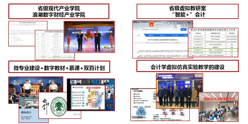 学院智能化专业建设源起于2019年成立的哈尔滨商业大学浪潮会计学院,同年,发起黑龙江数字财经产教联盟;2020年,组建智能会计教研室,设立会计学(智能会计)专业方向班,校企共建6门数智化核心课程,打造智能财务共享服务中心;2021年,“智能+会计”教研室获批省级虚拟教研室建设点,创办东三省首个“数智会计”微专业;2022年,浪潮数字经济产业学院获批省级现代产业学院,《数智赋能浪潮会计学院智能会计人才培养实践》项目入选中国高等教育博览会“校企合作 双百计划”典型案例;2023年,成立元宇宙教学研究中心。