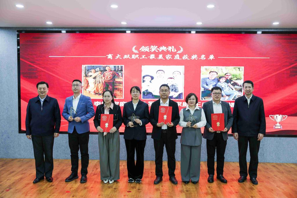 田成义宣读表彰决定。获得“夫妻和睦最美家庭”的金融学院段雨馨、英才学院李超宇、职业技术教育学院刘星池,获得“孝老爱亲最美家庭”的食品工程学院刘晓飞、食品工程学院马春敏,获得“教子有方最美家庭”的外语学院陈璐、设计艺术学院王珊珊、计算机与信息工程学院陈俊、后勤管理处王天华,获得“商大双职工最美家庭”的李洪莲与李博、孟秦与罗志坤、王鑫华与金福吉分别作故事分享。校领导为获奖家庭颁奖。