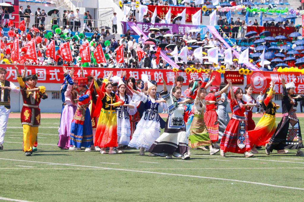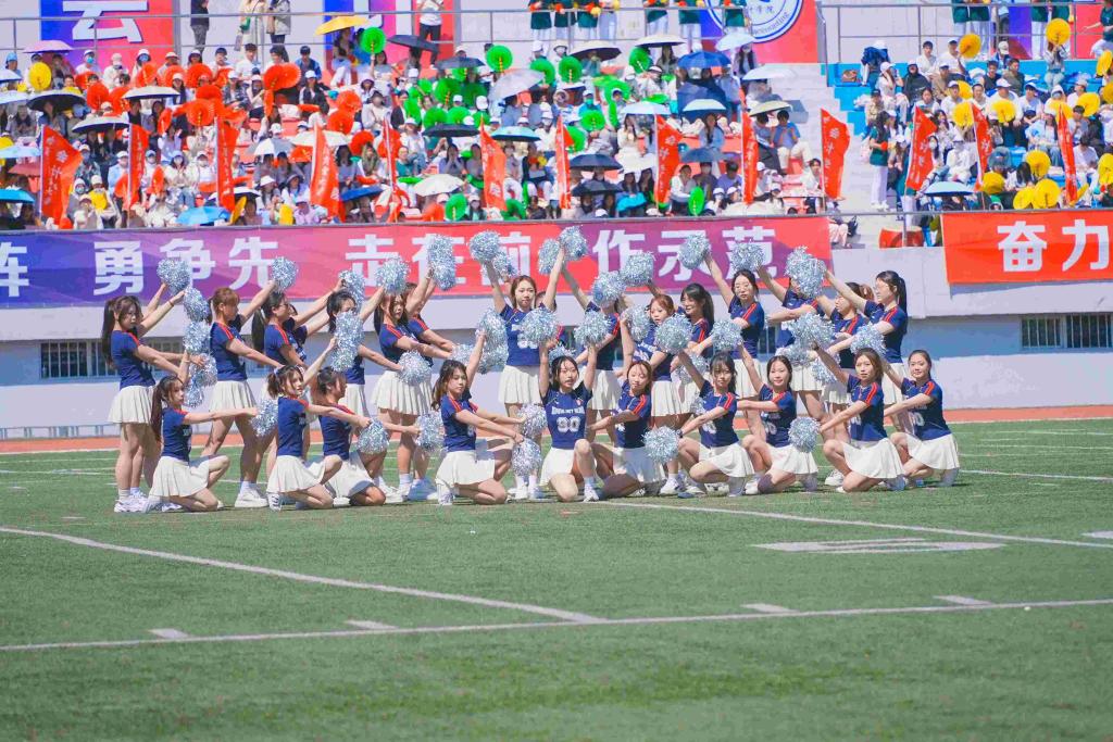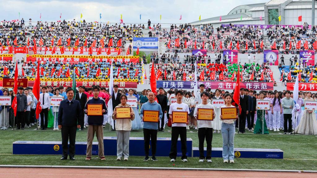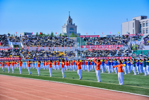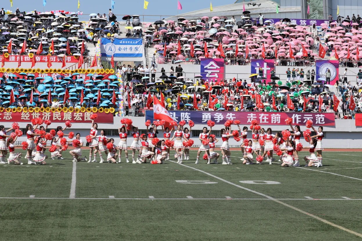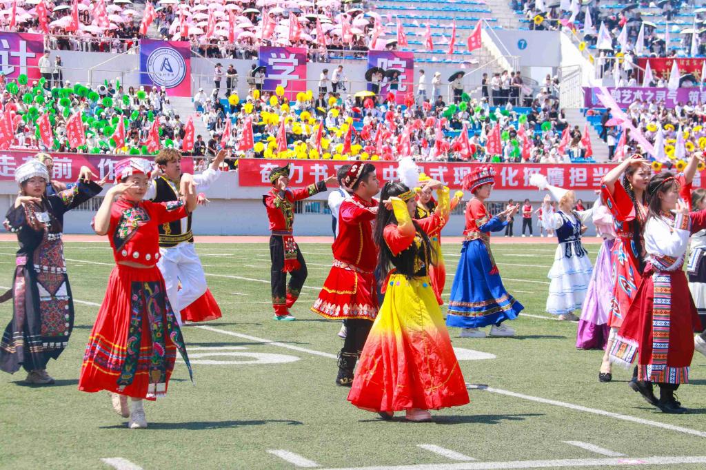 校大学生艺术团和各学院带来了充满青春活力和时代气息的啦啦操表演。随着动感的音乐响起,同学们的每一个动作都精准而有力,洋溢着青春的激情与活力,充分体现我校广大学生的昂扬风采和蓬勃朝气。统战部与学生工作部联合组织各民族师生带来了“中华民族一家亲”民族舞蹈。各民族师生身着斑斓的民族盛装,用跃动的舞蹈演绎着“中华民族一家亲”的深情篇章,脚步踏响的是“团结奋进、追求卓越”的哈商大精神,手臂扬起的是中华民族伟大复兴的共同愿景,舞蹈最后以“石榴籽”造型定格,运动场上响起雷鸣般的掌声。