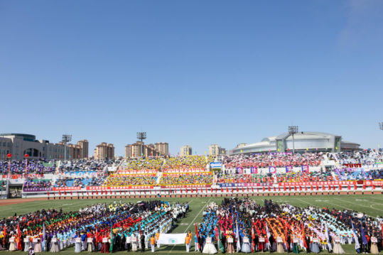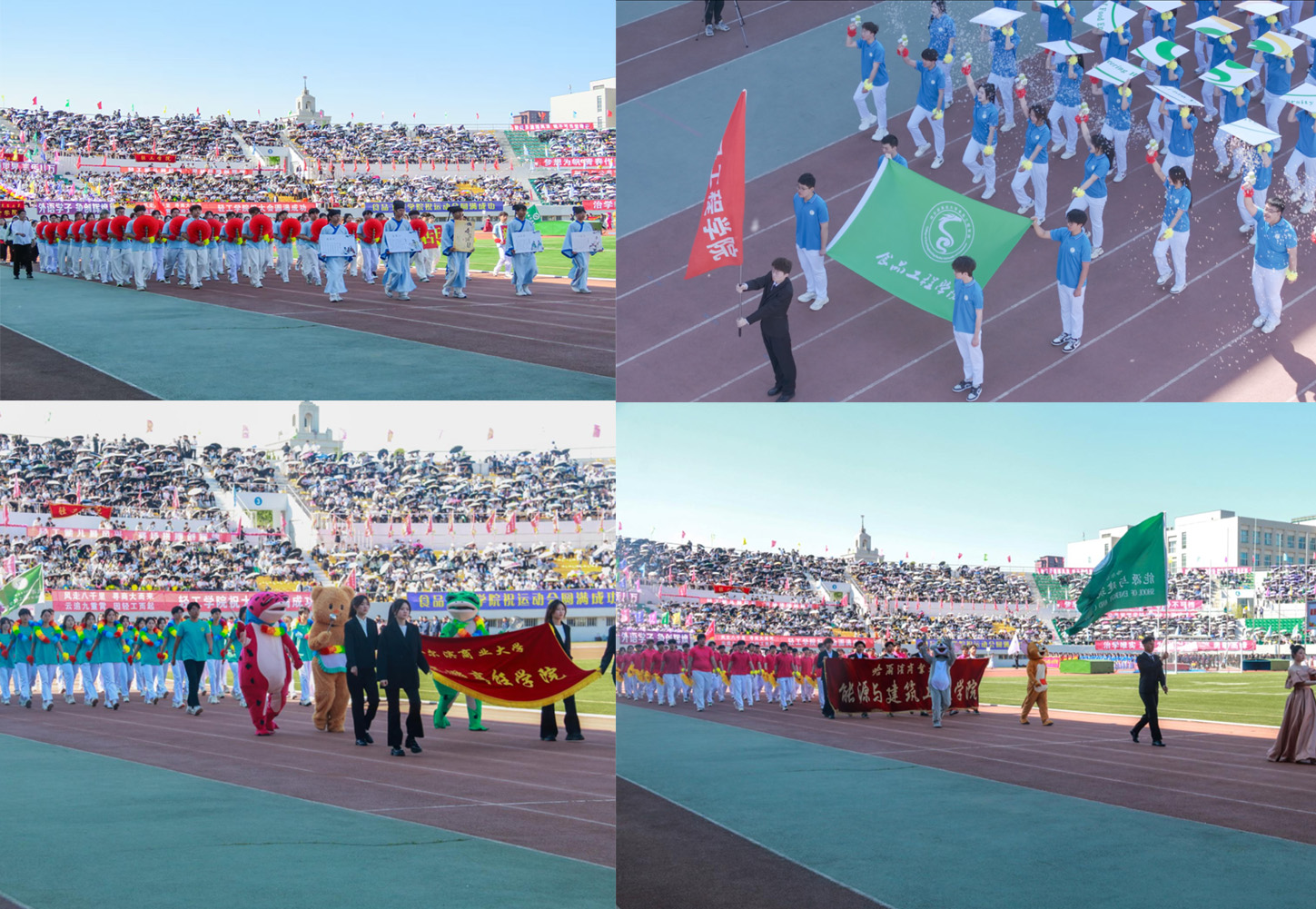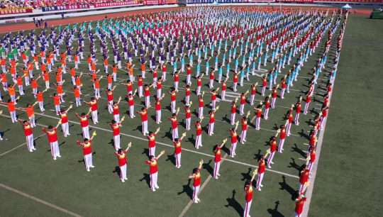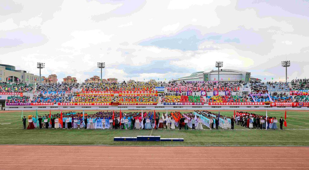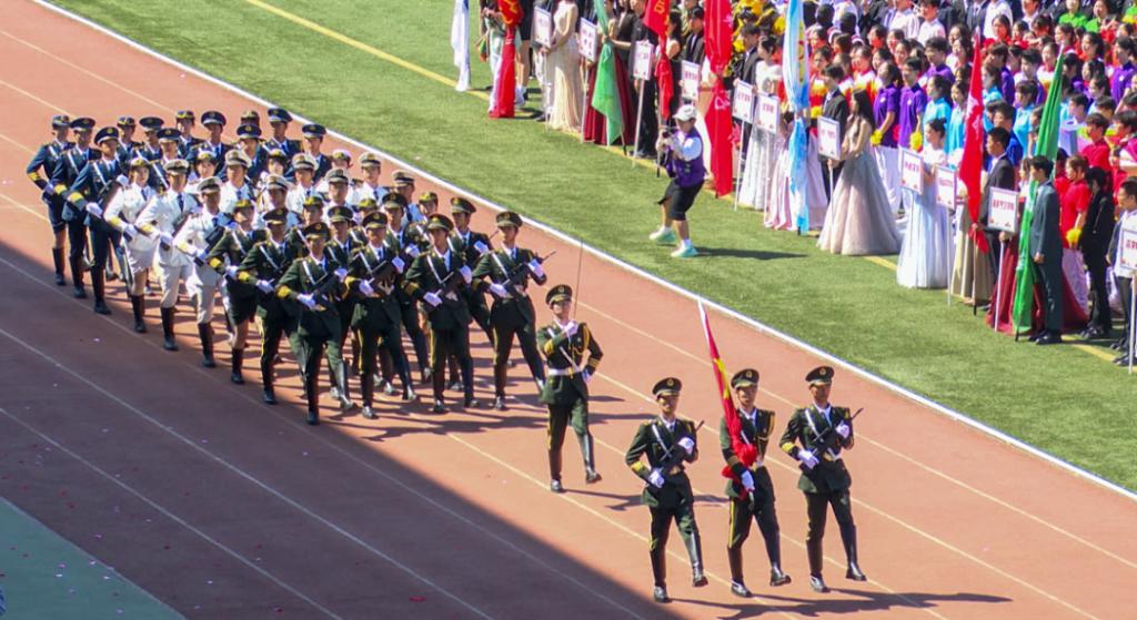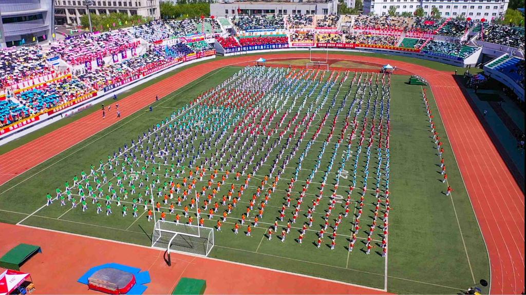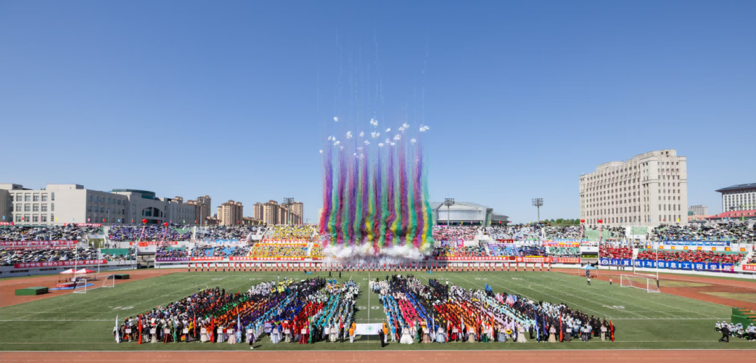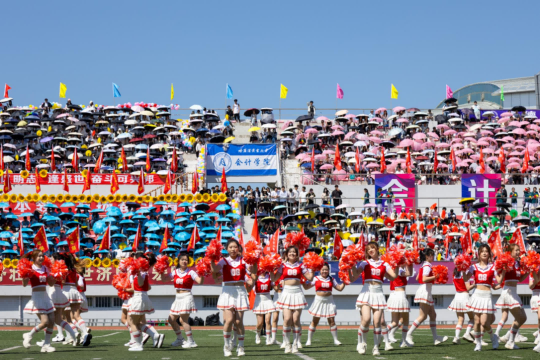 校大学生艺术团和各学院带来了充满青春活力和时代气息的啦啦操表演。随着动感的音乐响起,同学们的每一个动作都精准而有力,洋溢着青春的激情与活力,充分体现我校广大学生的昂扬风采和蓬勃朝气。统战部与学生工作部联合组织各民族师生带来了“中华民族一家亲”民族舞蹈。各民族师生身着斑斓的民族盛装,用跃动的舞蹈演绎着“中华民族一家亲”的深情篇章,脚步踏响的是“团结奋进、追求卓越”的哈商大精神,手臂扬起的是中华民族伟大复兴的共同愿景,舞蹈最后以“石榴籽”造型定格,运动场上响起雷鸣般的掌声。