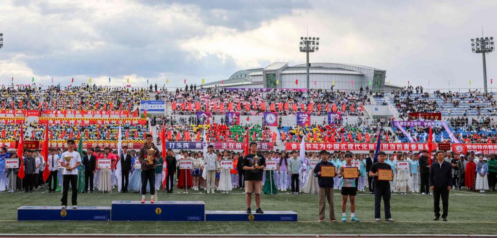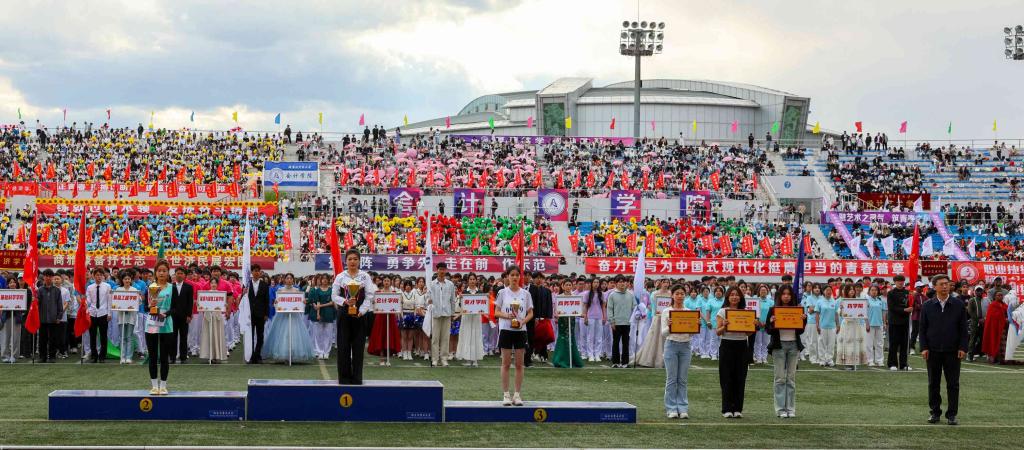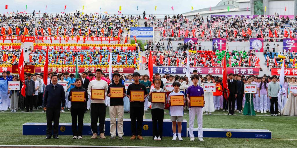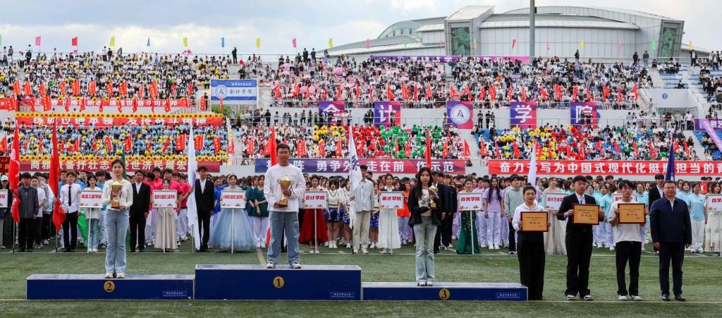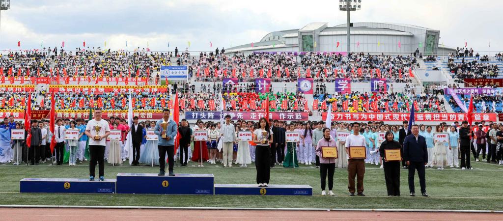 大会精神文明组组长、党委宣传部部长贾妮燕宣布精神文明奖评比成绩。大会裁判长张环宇宣布比赛成绩。校领导为获奖单位和个人颁奖。
