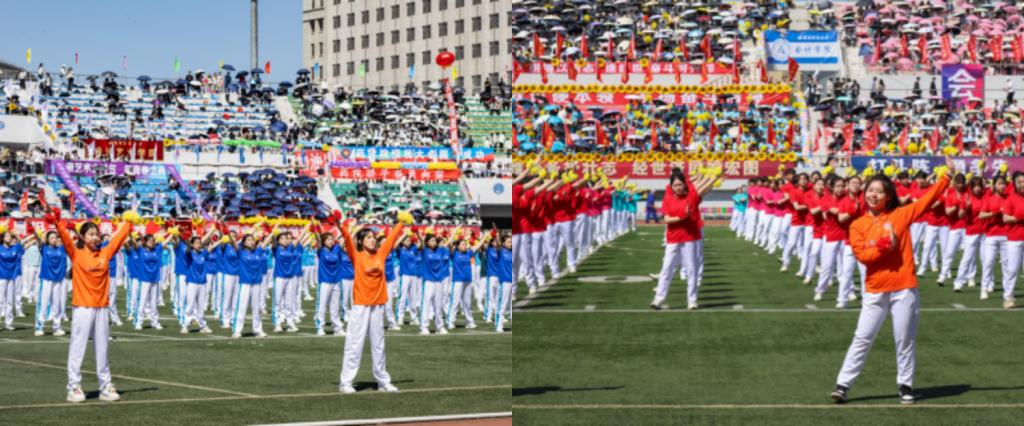 比赛正式开始前,集体操表演震撼登场。各学院方阵动作整齐划一,尽显青春活力与风采。看台同学互动热情高涨,共同交织出一幅青春洋溢、蓬勃奋进的画卷,为这场体育盛会拉开激昂的序幕。