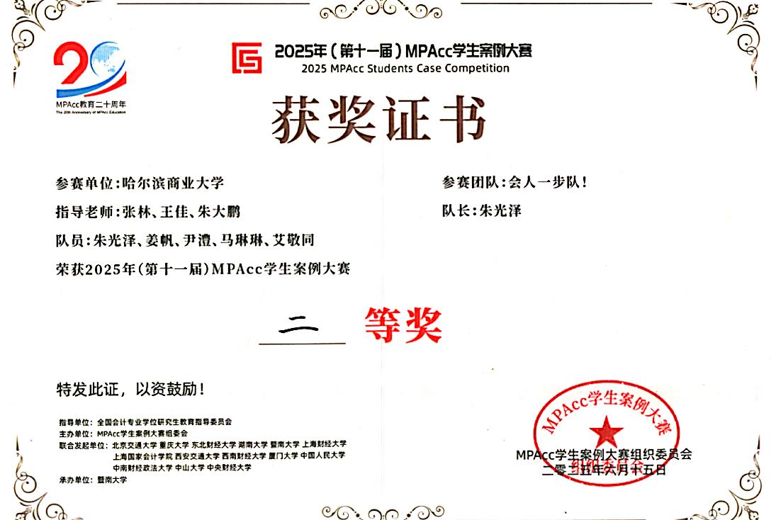 在3月至6月举办的第十一届全国MPAcc学生案例大赛中,由我校会计学院学生朱光泽、姜帆、尹澧、马琳琳、艾敬同组成的哈尔滨商业大学“会人一步队!”以黑马之姿首次跻身全国十强,最终斩获全国二等奖,刷新了黑龙江省高校在该赛事中的历史最佳成绩。
