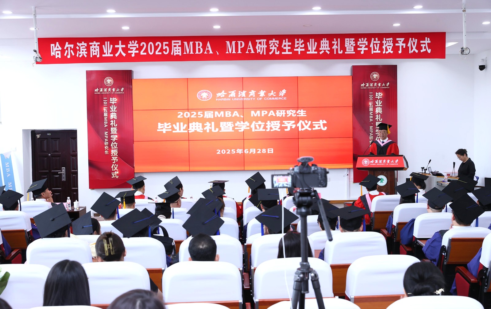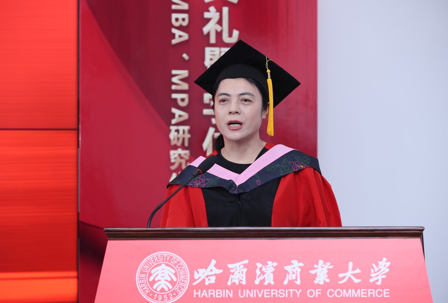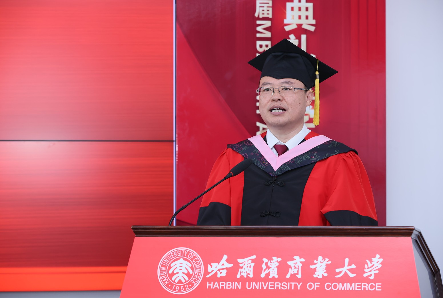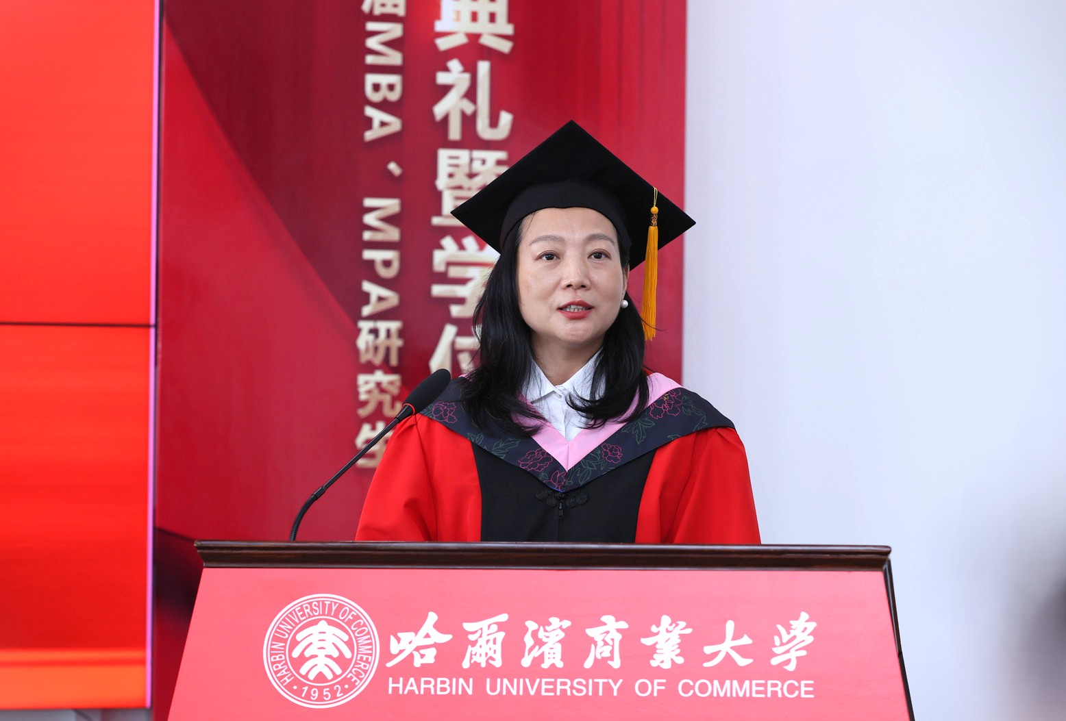 赵春雨宣读《关于授予哈尔滨商业大学2025届MBA、MPA研究生硕士学位的决定》,希望毕业生恪守“求真至善,修德允能”校训,将个人理想融入国家和民族事业,以实际行动为母校增光添彩。