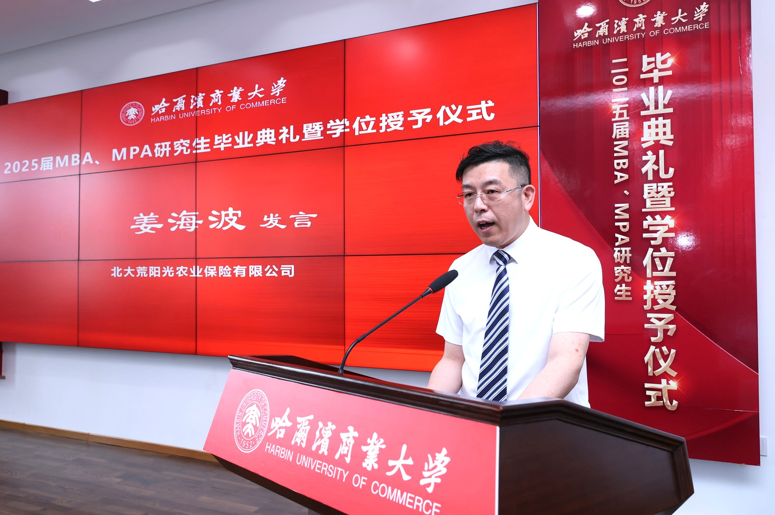 毕业生代表、2022级MBA-4班研究生、北大荒阳光保险集团姜海波深情表达了对母校培育的感激与眷恋,他表示未来将继续勇担社会责任,今日以母校为荣,他日努力成为母校荣光。