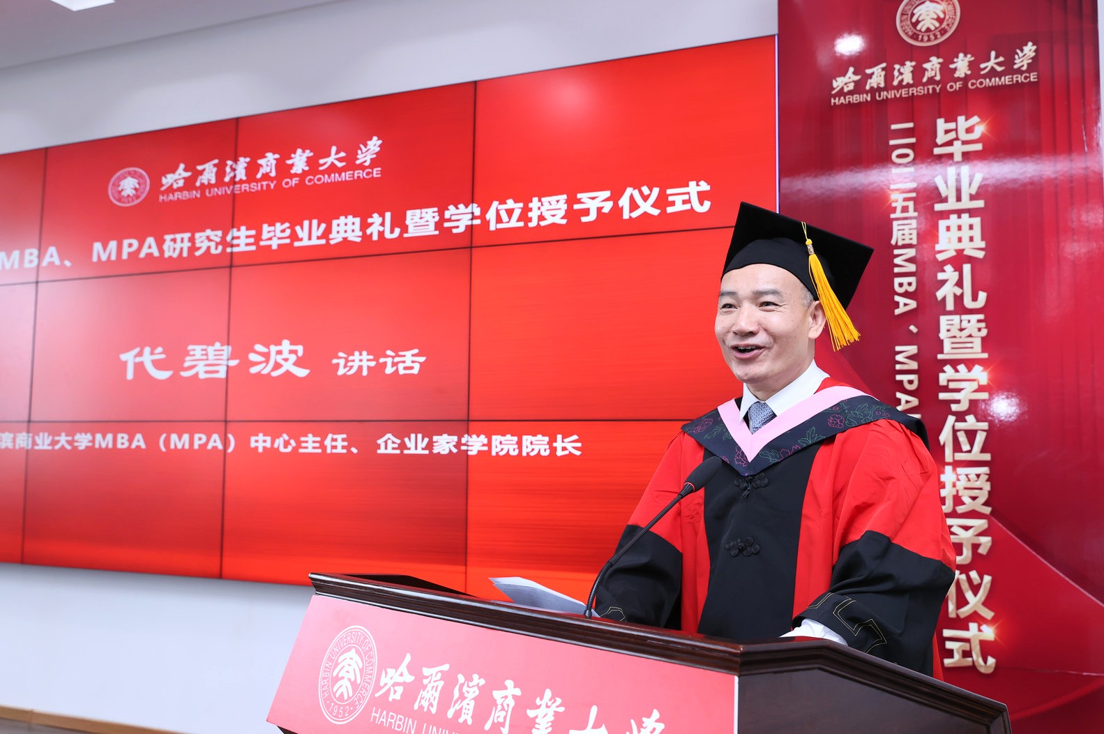 代碧波代表MBA(MPA)中心和企业家学院全体教职员工,向成功获得学位的毕业生致以热烈祝贺。他寄语毕业生,当风浪袭来时,要始终牢记松花江畔练就的“从容”;当迷雾重重时,要以心中“梦想”照亮前路;当行至远方时,莫忘黑土地滋养的“根系”,温暖每一位同行者!