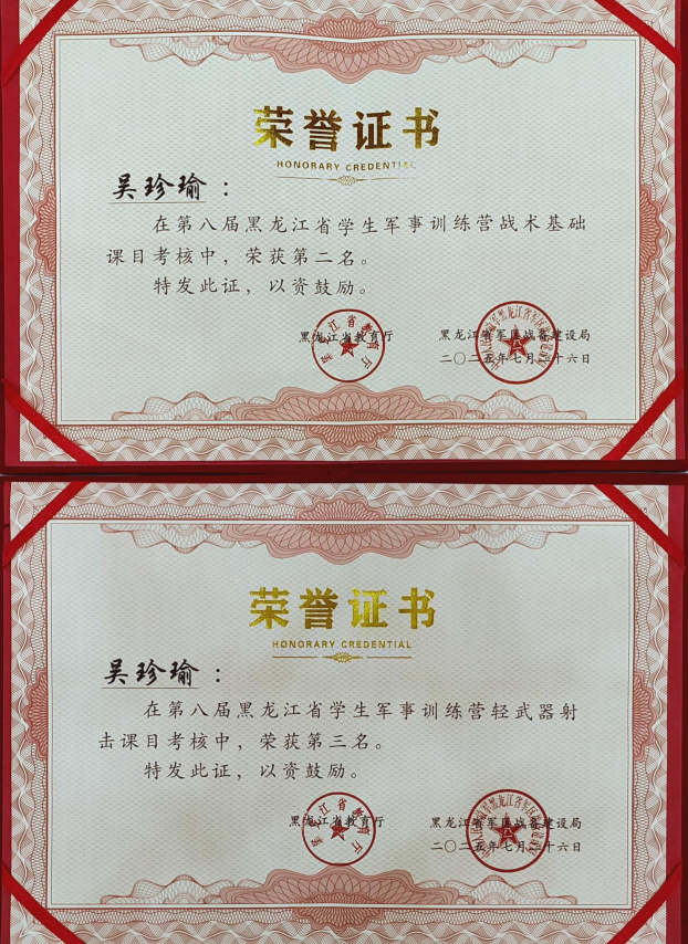 7月16日,由黑龙江省教育厅、黑龙江省军区战备建设局主办的第八届黑龙江省学生军事训练营圆满落幕。我校选派的财政与公共管理学院吴珍瑜同学在为期一周的活动中,凭借过硬的军事素养、顽强的拼搏精神,克服高温酷暑,认真备赛,在战术基础、轻武器射击课目中表现突出,分别荣获单项第二名、第三名的优异成绩。