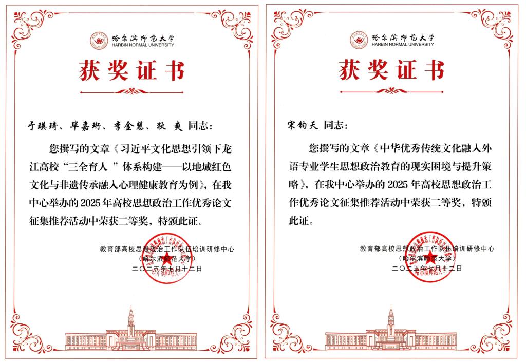 为提升高校思想政治工作队伍素质能力,切实推动高校思想政治工作高质量发展,高校思想政治工作队伍培训研修中心(哈尔滨师范大学)组织开展了2025年高校思想政治工作优秀论文征集活动,我校积极组织申报,并进行严格遴选和规范推荐。最终,我校选送的学生工作部教师于瑛琦、毕嘉珩、李金慧、狄爽的论文《习近平文化思想引领下龙江高校“三全育人 ”体系构建——以地域红色文化与非遗传承融入心理健康教育为例》与外语学院辅导员宋钧天的论文《中华优秀传统文化融入外语专业学生思想政治教育的现实困境与提升策略》荣获优秀论文二等奖。