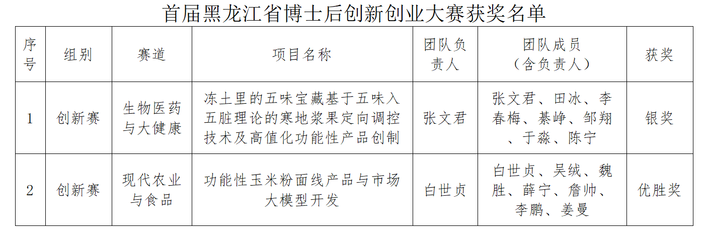 7月30日,黑龙江省人力资源和社会保障厅公布了首届黑龙江省博士后创新创业大赛获奖结果,比赛择优确定了金奖、银奖、铜奖和优胜奖共计52支获奖团队,我校两支参赛团队分获银奖1项、优胜奖1项。张文君团队还将代表我省参加第三届全国博士后创新创业大赛。