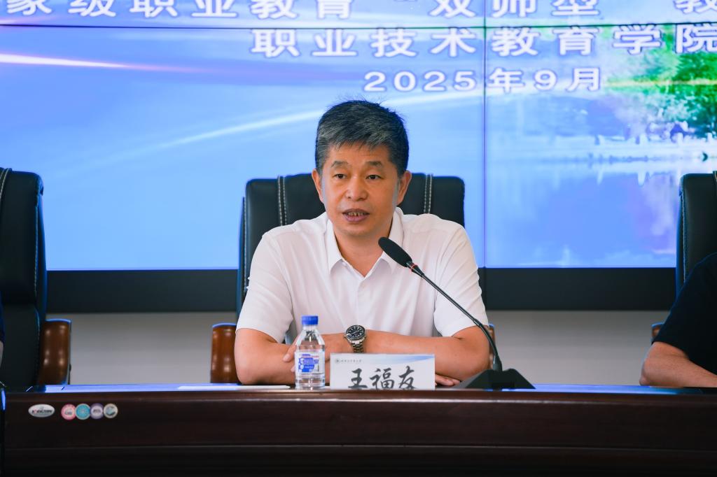 9月2日,河南省2025年度职业院校教师素质提高计划项目专业带头人课程实施能力提升培训开班典礼在我校南校区主楼408室举行。校党委常委、副校长王福友出席开班式,计算机与信息工程学院院长郑德权、会计学院党委书记张春明、职业技术教育学院院长金代志参加开班式。开班式由职教学院继教学院党总支书记刘兴革主持。