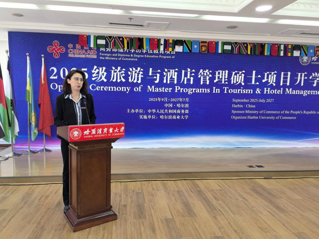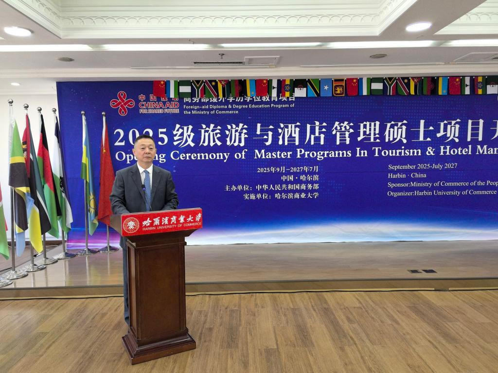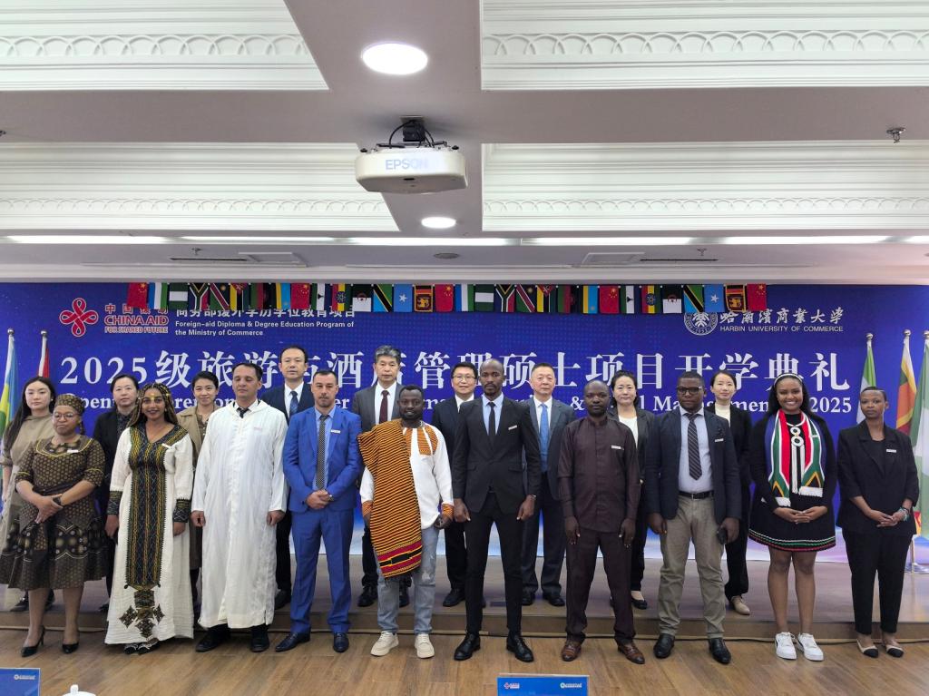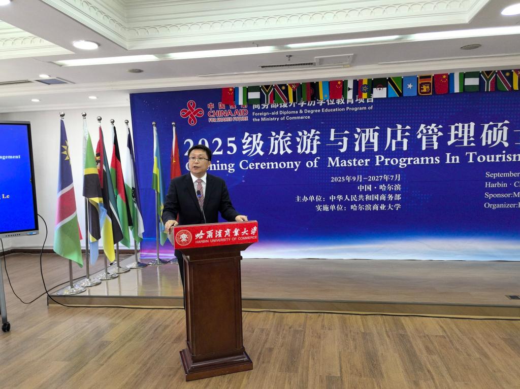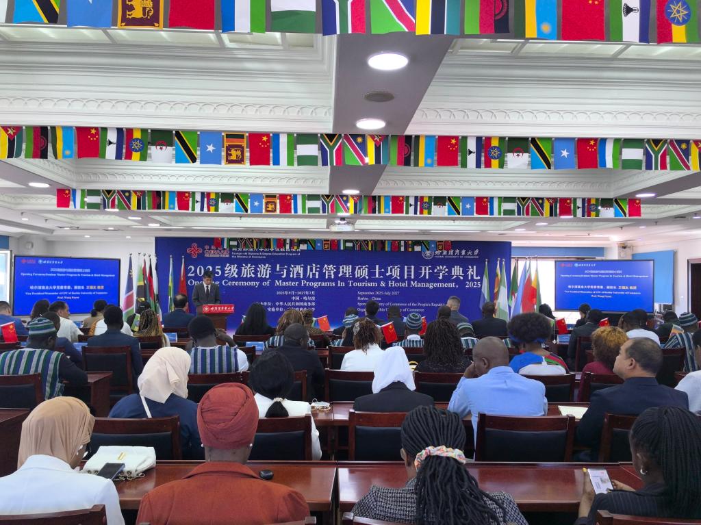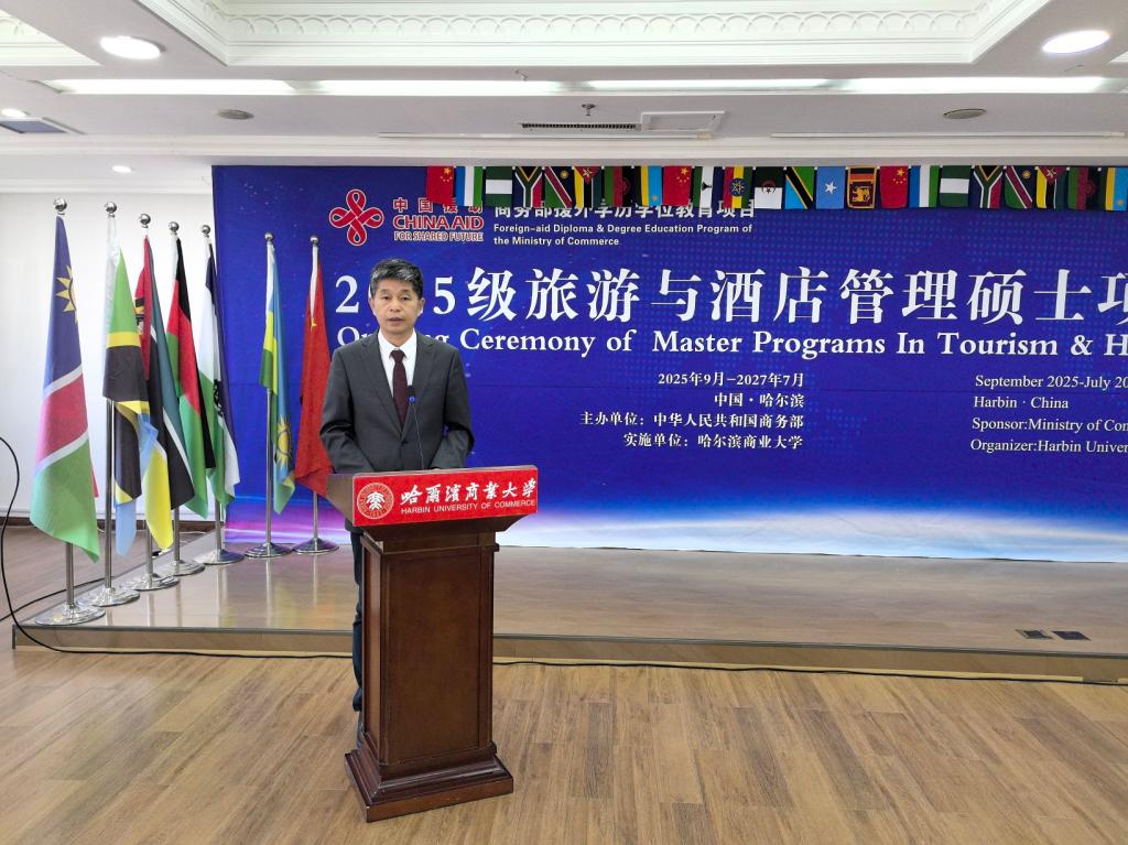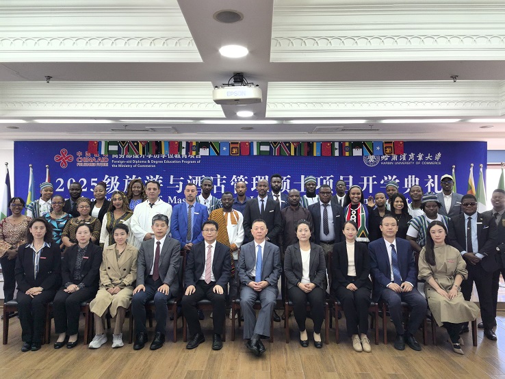 9月18日上午,由商务部主办、哈尔滨商业大学承办的“2025级旅游与酒店管理”援外培训硕士项目开学典礼在我校举行。商务部国际商务官员研修学院党委副书记、纪委书记郑乐,黑龙江省商务厅二级巡视员韩东安,校党委常委、副校长王福友出席典礼;我校国际教育学院、旅游烹饪学院相关人员以及来自阿尔及利亚、埃塞俄比亚、斯里兰卡等13个国家的30名新同学参加开学典礼。