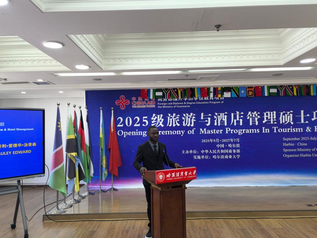 中国驻塞拉利昂大使馆经商处刘斯钰代表校友线上发言。他回顾了自己在哈尔滨商业大学的求学时光,希望新同学主动参与文化交流,在优质教学环境中锤炼本领,借助商大校友网络与驻外使领馆资源,成为跨文化理解的桥梁,成为本国与中国合作的纽带。