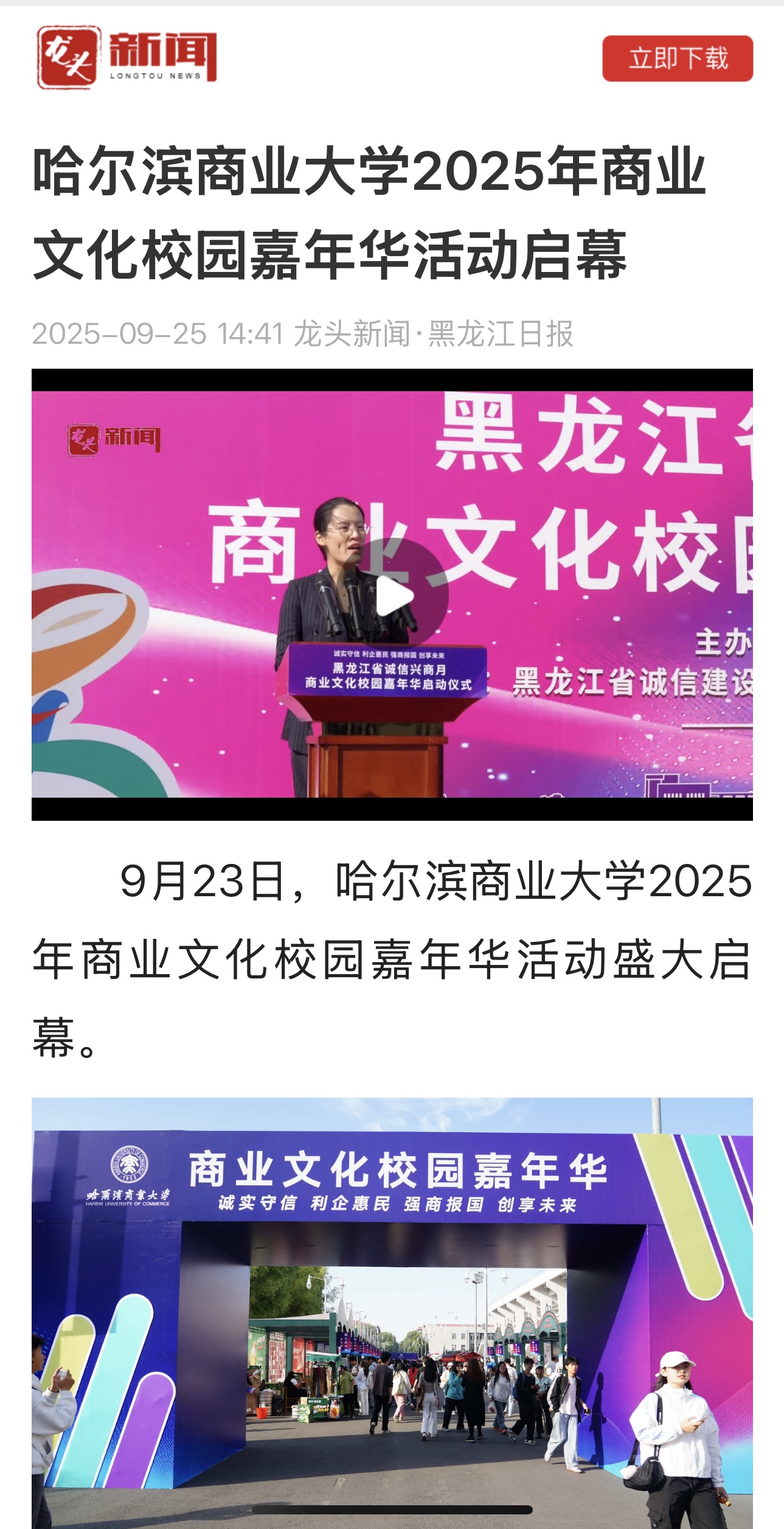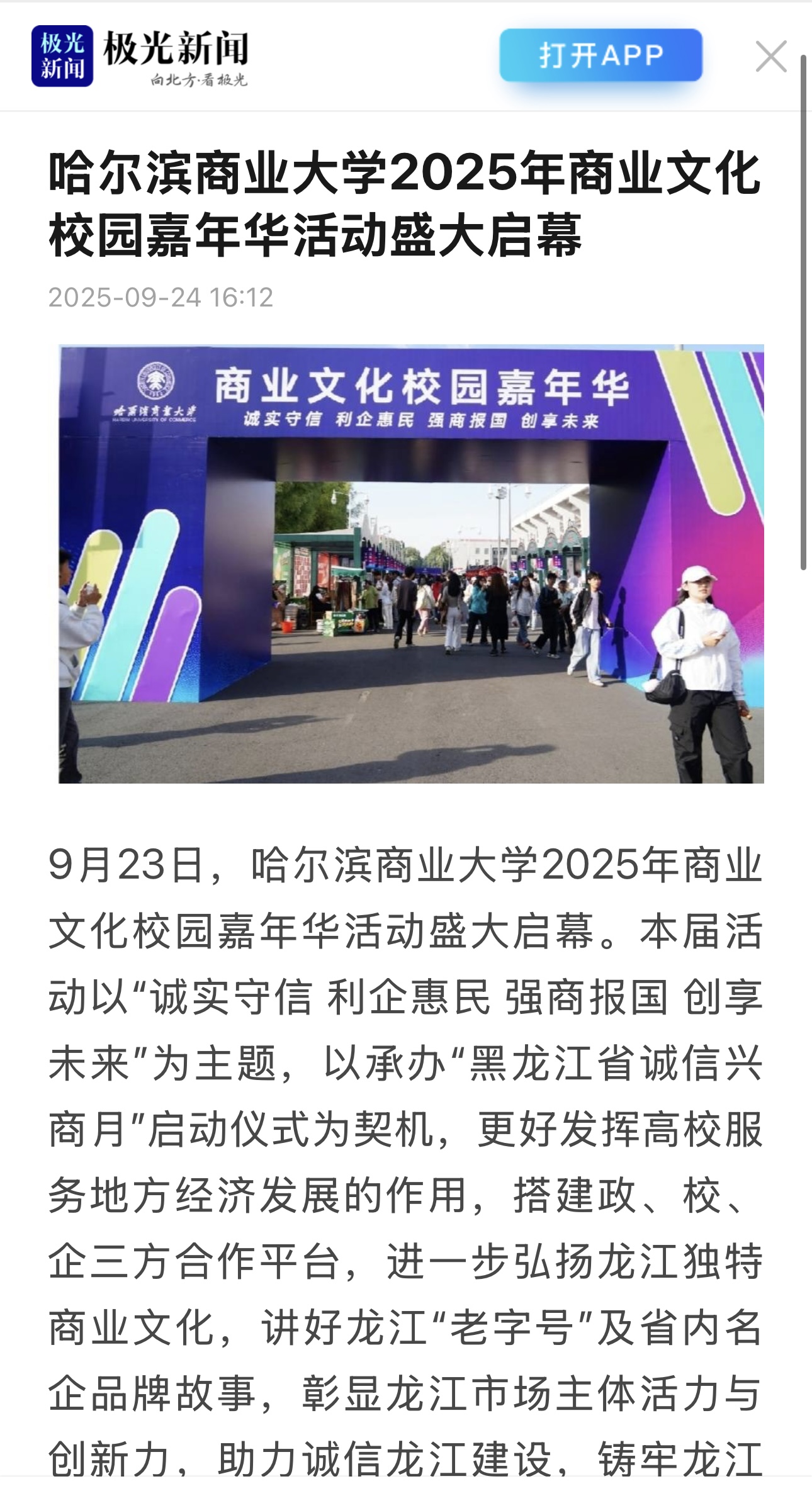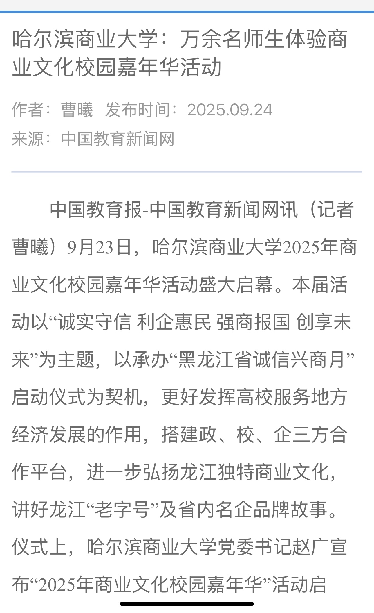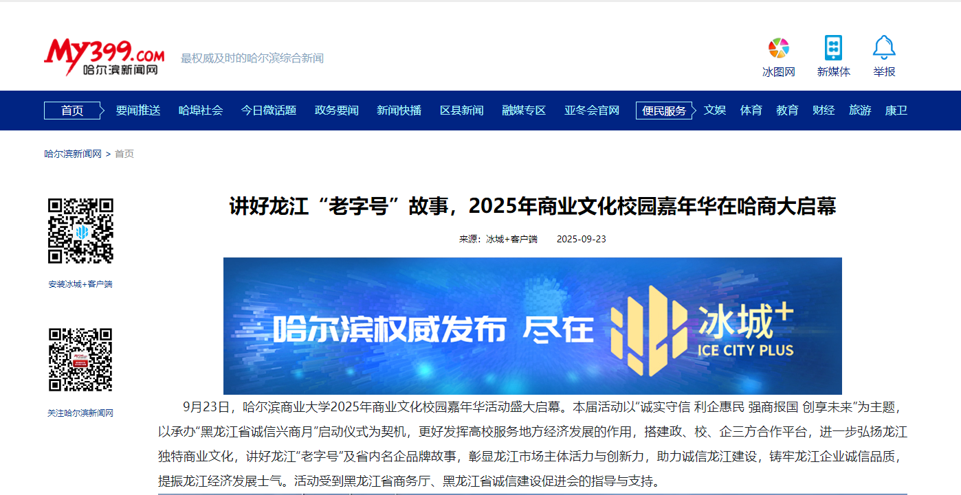 9月23日,哈尔滨商业大学2025年商业文化校园嘉年华活动盛大启幕。哈尔滨新闻、黑龙江日报、极光新闻、中新网、央广网、中国教育报、中国教育在线、东北网、龙头新闻、哈尔滨日报、生活报、新晚报、腾讯新闻、哈尔滨新闻网等多家媒体平台给予活动关注报道。