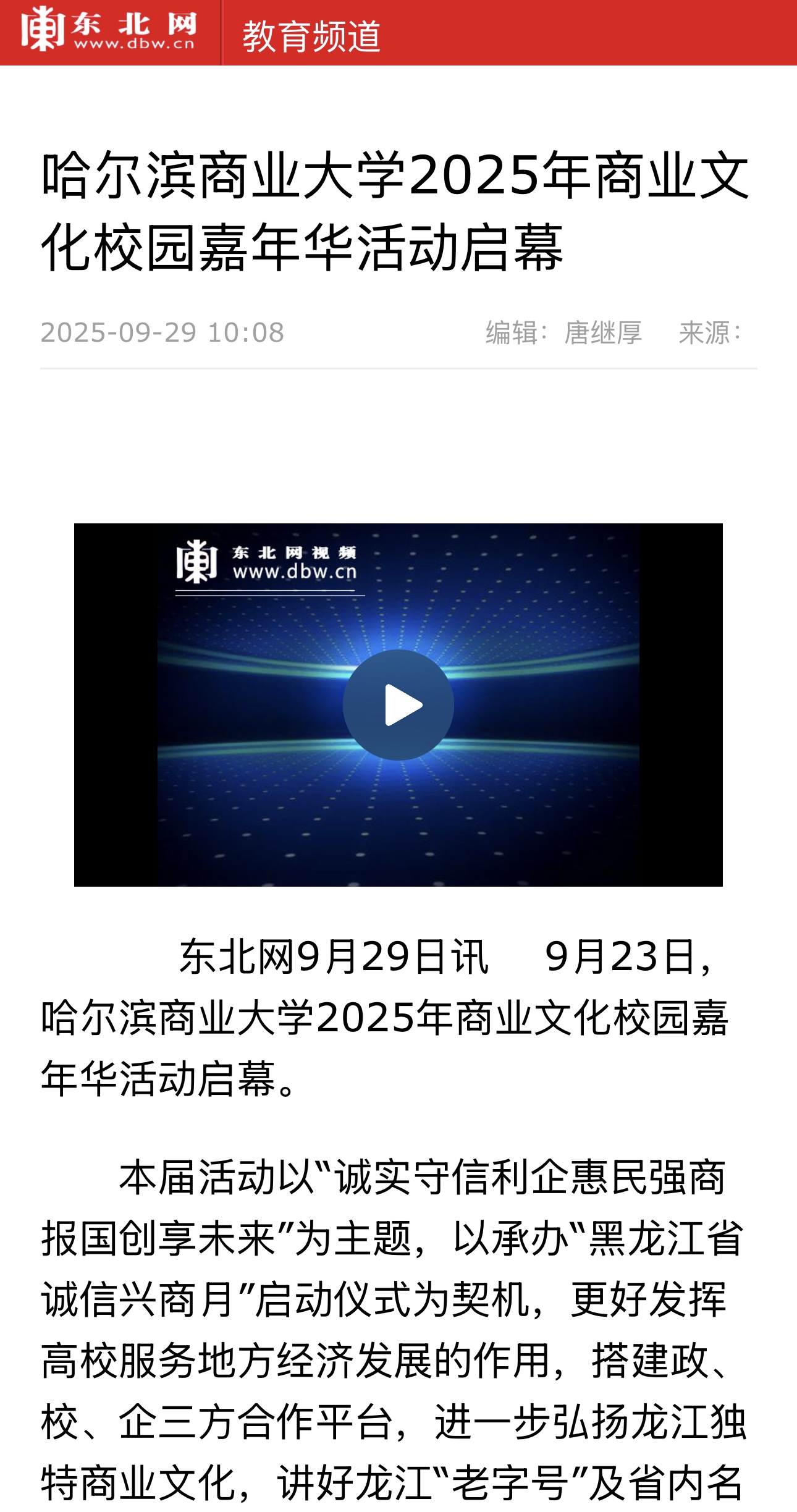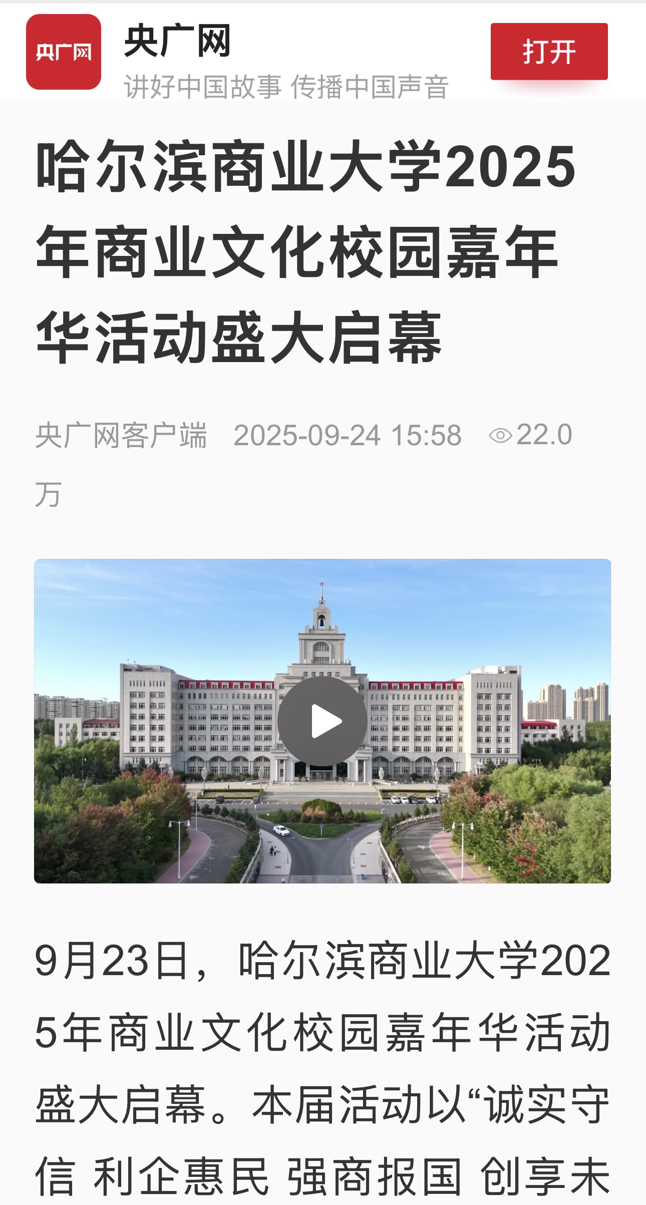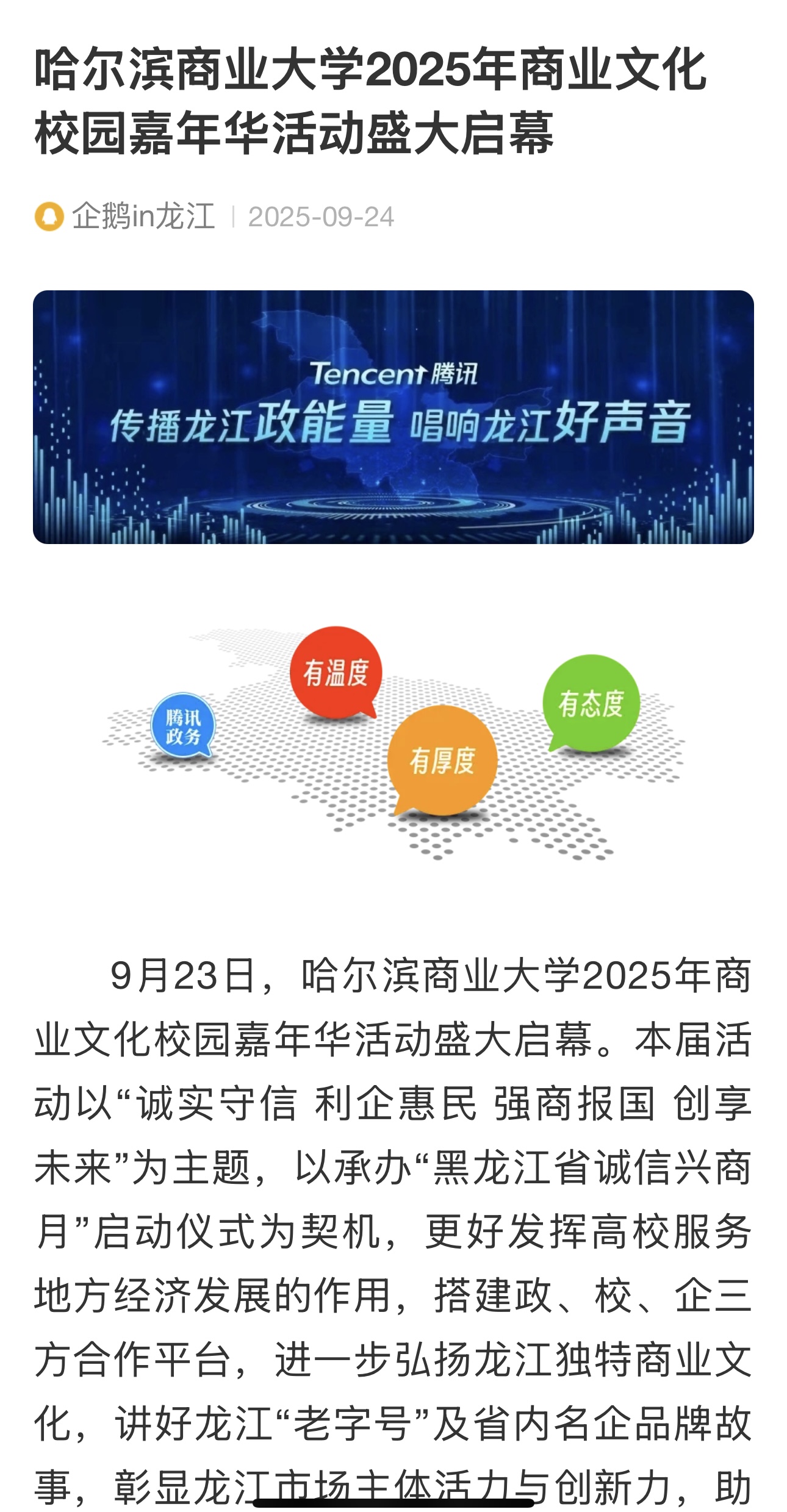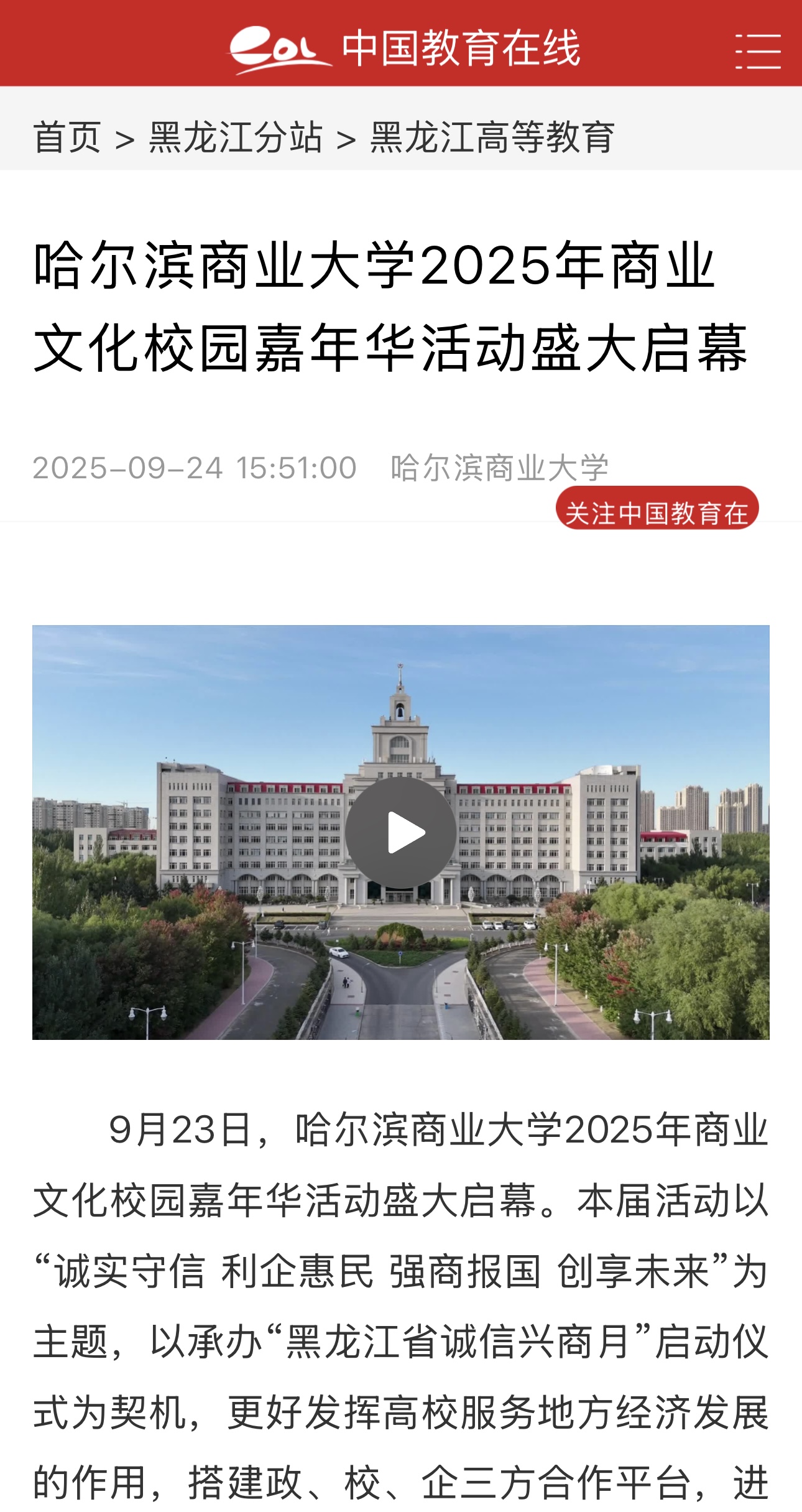 9月23日,哈尔滨商业大学2025年商业文化校园嘉年华活动盛大启幕。哈尔滨新闻、黑龙江日报、极光新闻、中新网、央广网、中国教育报、中国教育在线、东北网、龙头新闻、哈尔滨日报、生活报、新晚报、腾讯新闻、哈尔滨新闻网等多家媒体平台给予活动关注报道。