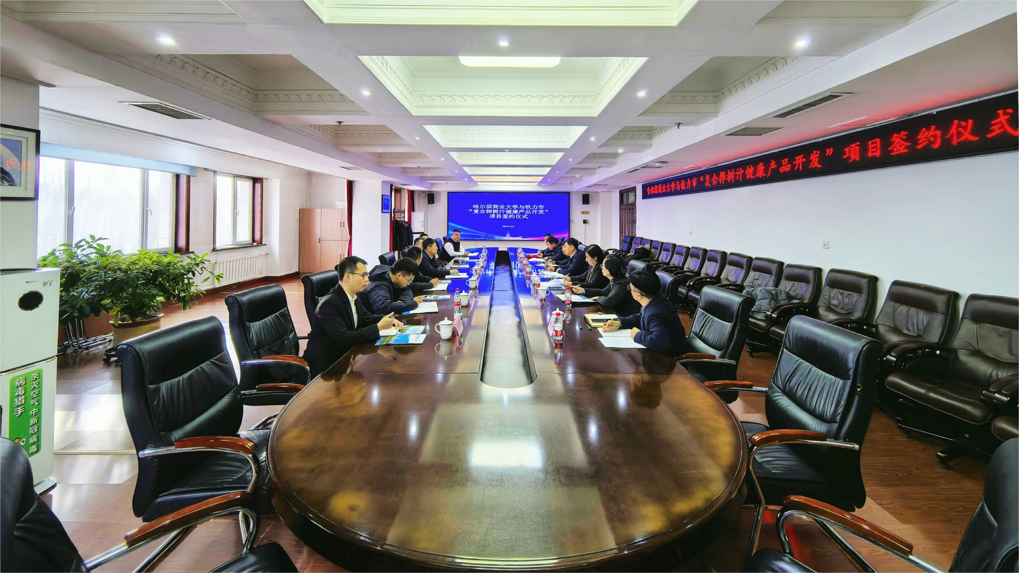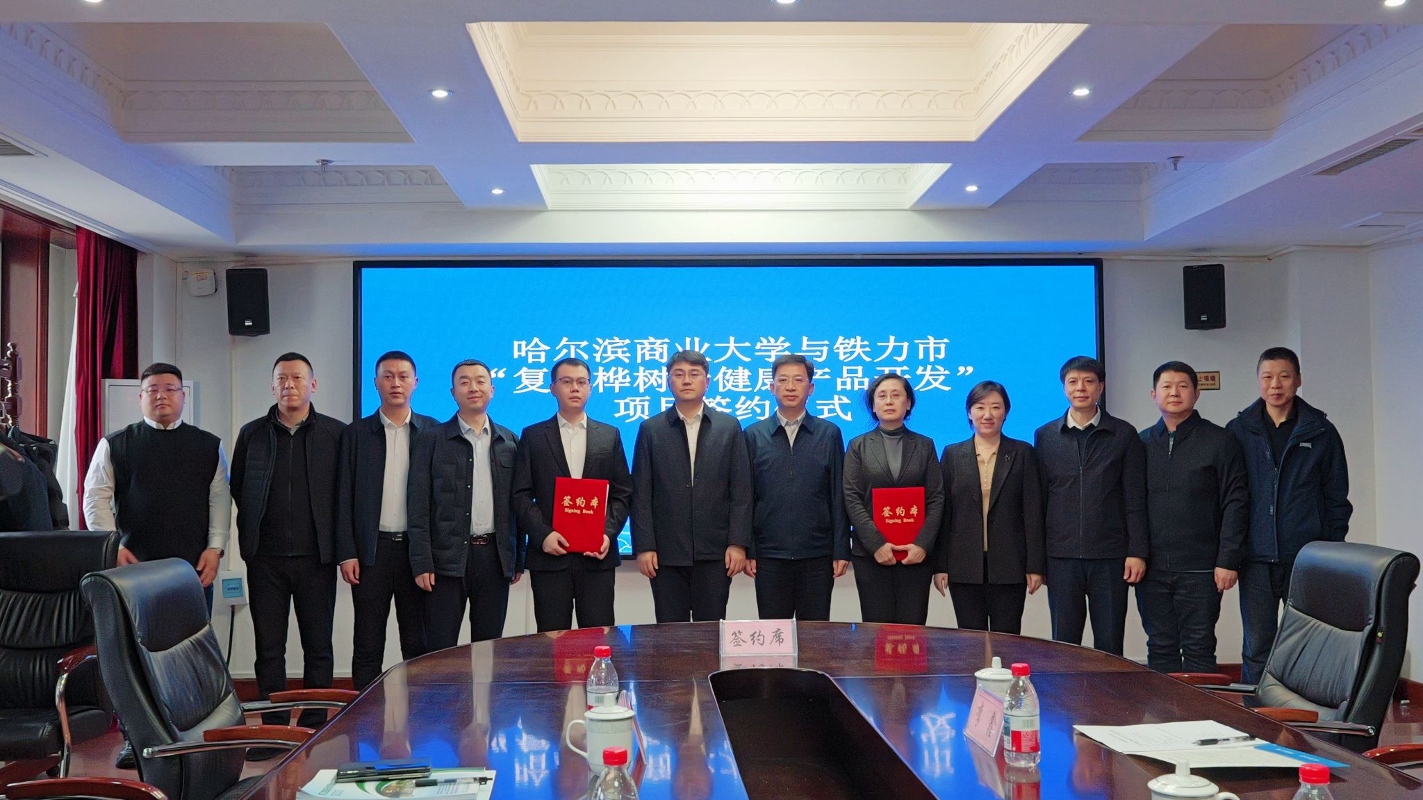 李文兰与铁力市瀚达工程管理服务有限责任公司董事长刘司玉签订项目合作协议。在项目对接交流环节,与会人员围绕桦树汁深加工技术研发、成果转化等内容展开深入交流。
