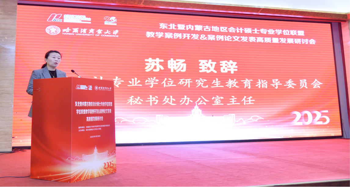 苏畅表示,东北暨内蒙古地区会计硕士专业学位联盟自2024年成立以来,紧密围绕国家特别是东北全面振兴战略需求,在促进区域会计硕士培养单位交流协作、资源共享、平台共用、协同发展等方面发挥了不可替代的作用。本次研讨会聚焦“教学案例开发”与“案例论文发表”两大主题,精准切中了MPAcc教育提质发展的关键环节,充分体现了联盟及主办单位对教学案例和案例论文发表的高度重视。苏畅对哈尔滨商业大学会计学院精心筹备本次会议表示感谢。