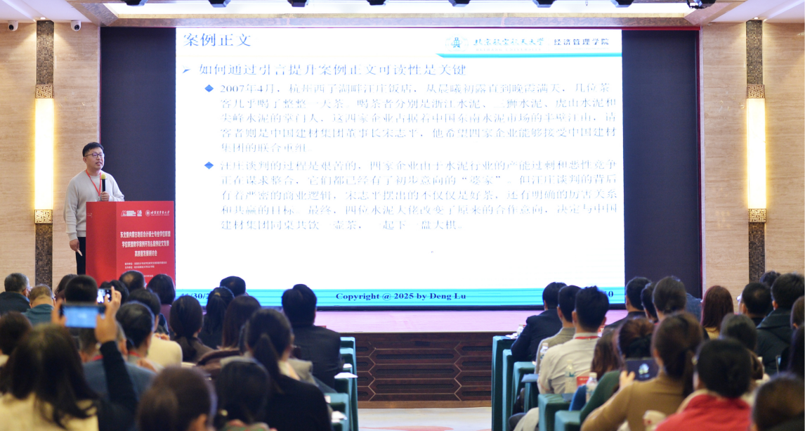 邓路作题为《“中国情境哈佛范式”财务管理案例开发与教学》的主题报告。邓路结合自身十余年斩获26篇国家级优秀教学案例的实践经验,系统阐释了哈佛案例教学法的核心理念与叙事结构,深入剖析了描述型与决策型案例的写作差异,并从选题策略、逻辑建构、教学应用等多维度,为案例开发提供了兼具理论高度与实践深度的指导。