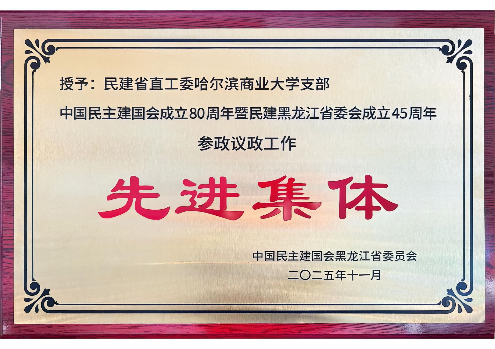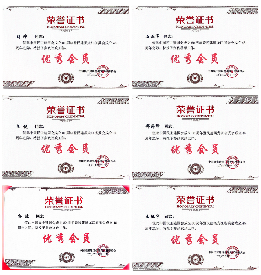 在庆祝中国民主建国会成立80周年暨民建黑龙江省委会成立45周年之际,民建省直工委哈尔滨商业大学支部凭借扎实的履职成效和突出的工作业绩,荣获“参政议政工作先进集体”称号,支部会员刘冰、孙源、陈健、王征宇、郑海峰等获评“参政议政工作优秀会员”,石正军获评“思想宣传工作优秀会员”。