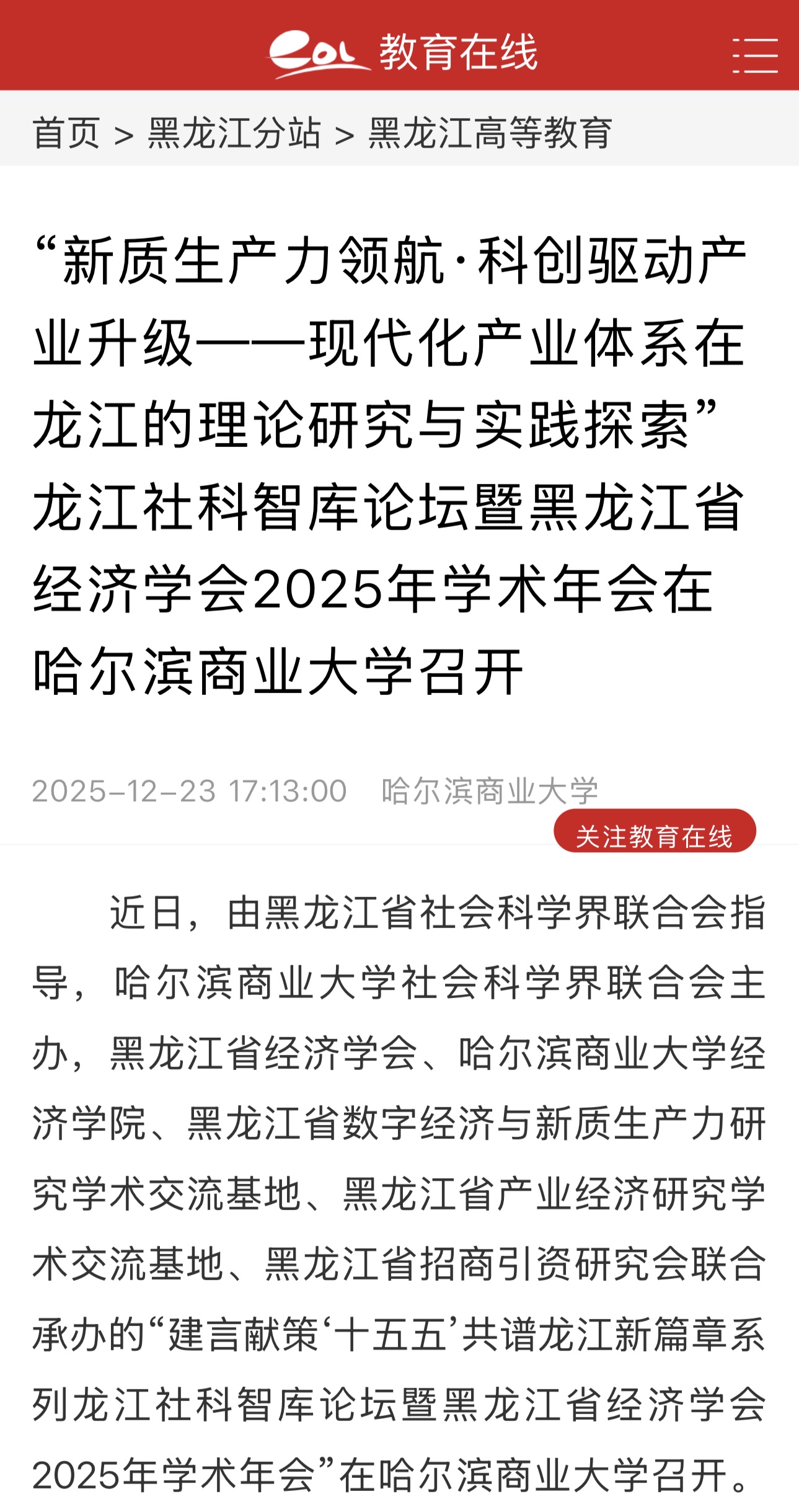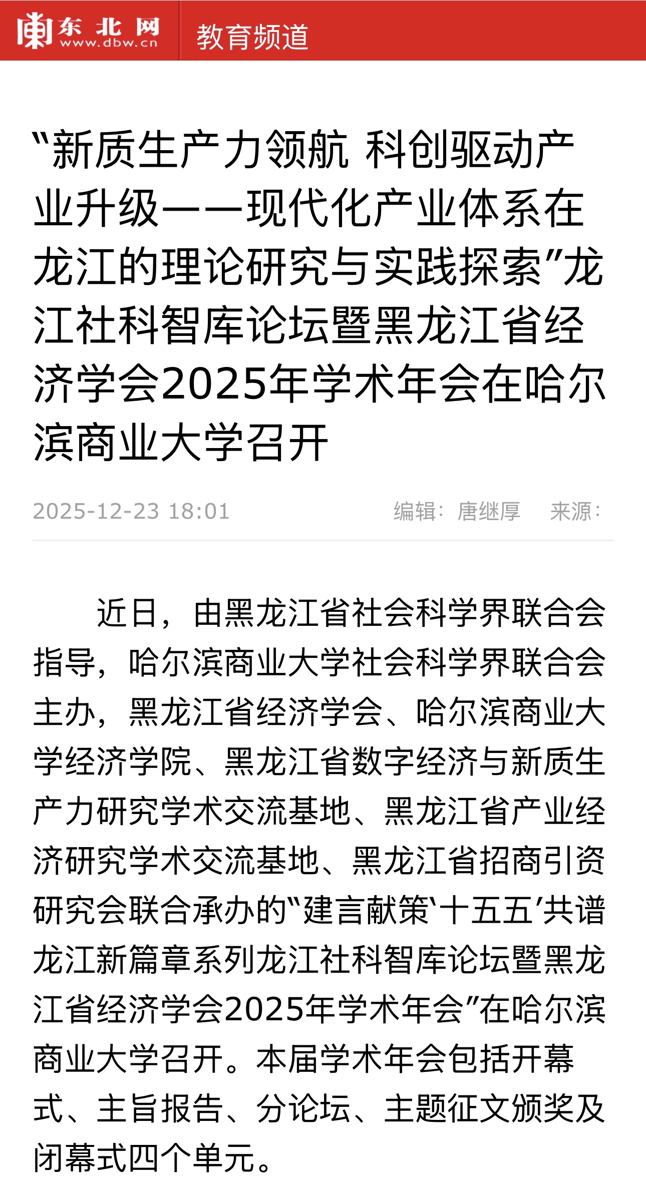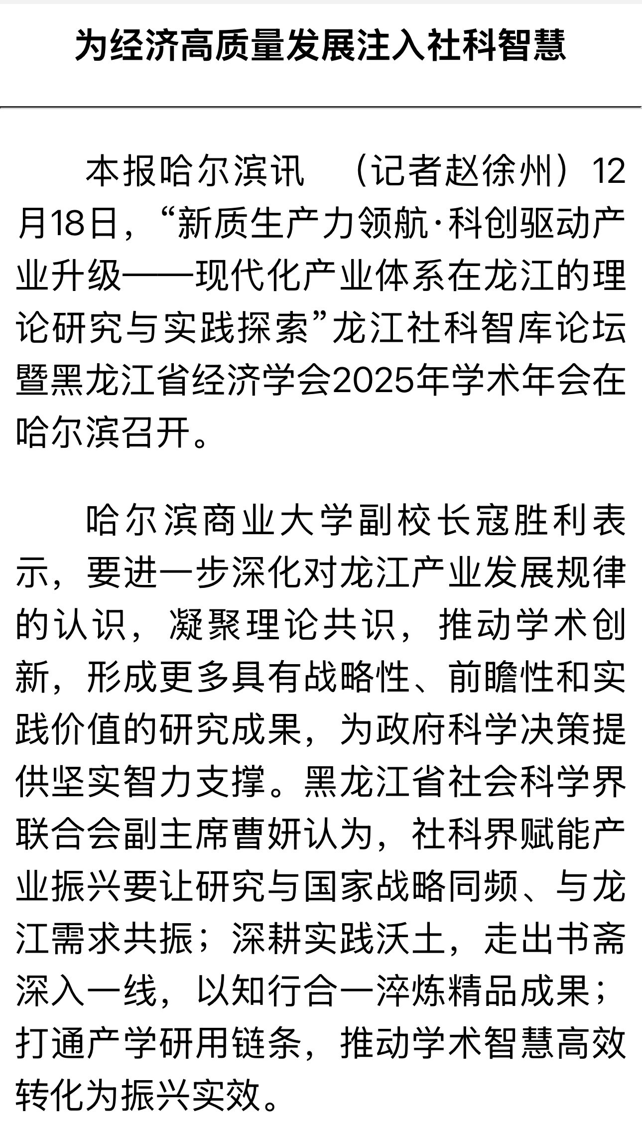 近日,由黑龙江省社会科学界联合会指导,我校社会科学界联合会主办,黑龙江省经济学会、我校经济学院、黑龙江省数字经济与新质生产力研究学术交流基地、黑龙江省产业经济研究学术交流基地、黑龙江省招商引资研究会联合承办的“建言献策‘十五五’共谱龙江新篇章系列龙江社科智库论坛暨黑龙江省经济学会2025年学术年会”在我校召开。本届学术年会主题为:“新质生产力领航·科创驱动产业升级——现代化产业体系在龙江的理论研究与实践探索”。论坛开展情况受到中国网、中国社会科学报、中国教育在线、东北网、生活报、腾讯新闻等多家媒体关注报道。