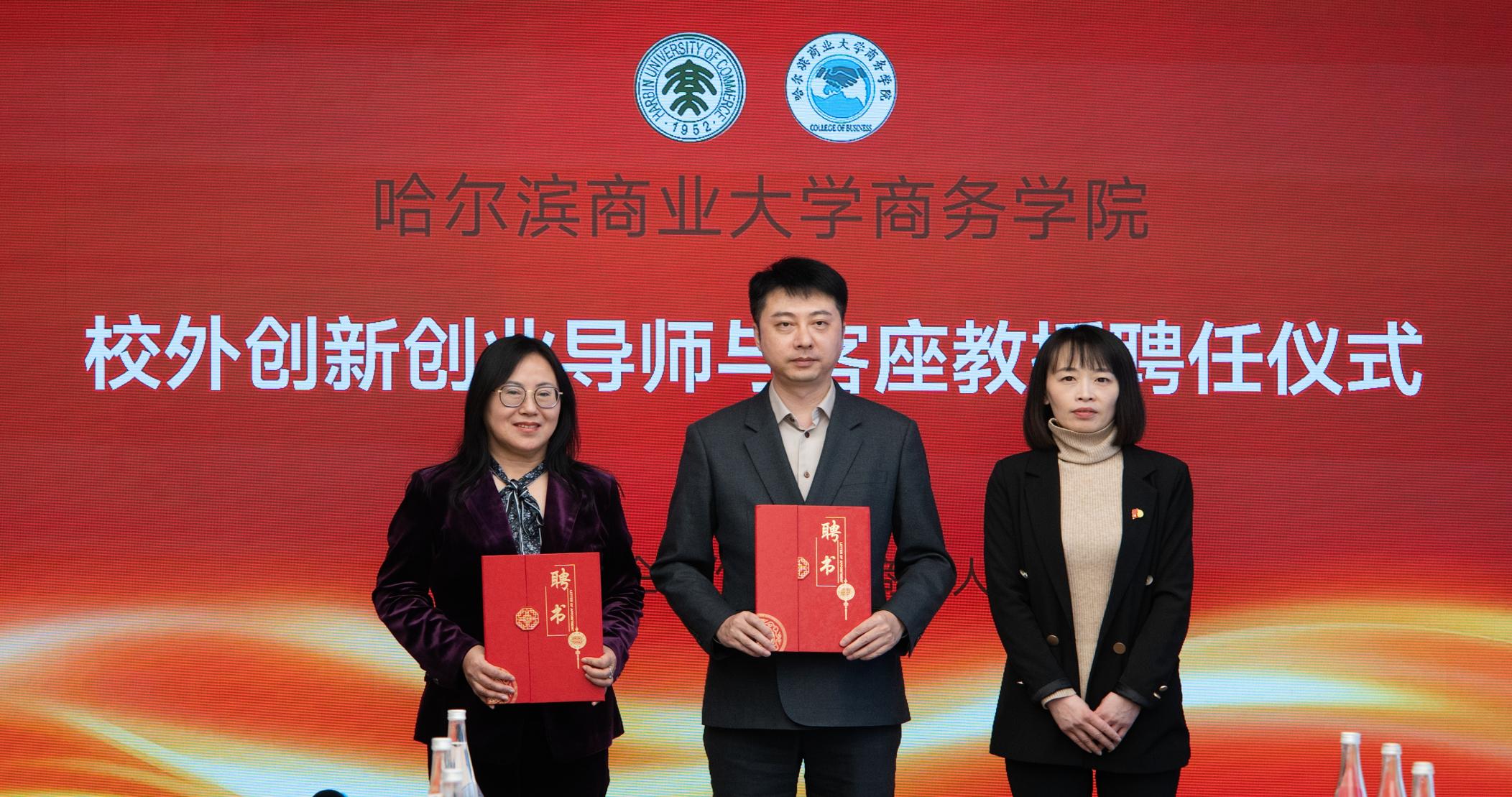 赵莉为王仁刚、黑龙江易商教育科技有限公司总经理刘广耀颁发“客座教授”“校外创新创业导师”聘书