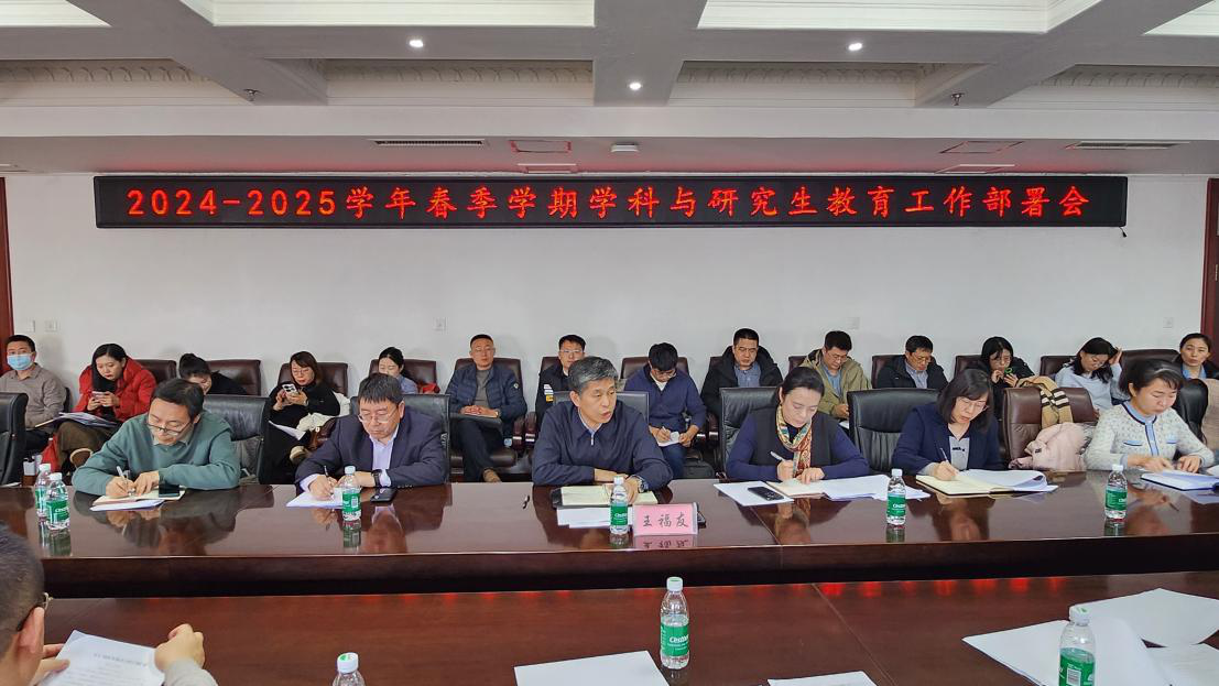 为全面落实教育强国建设的战略任务,统筹推进学科建设与研究生教育高质量发展,3月6日下午,我校在行政楼3楼会议室召开2024-2025学年春季学期学科与研究生教育工作部署会。党委常委、副校长王福友出席会议并讲话,各学院院长、分管副院长、学科及专业学位带头人、职能部门负责人及研究生学院全体成员参加会议。会议由研究生学院院长赵春雨主持。