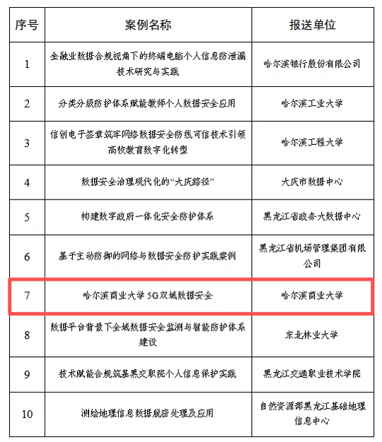 近日,中共黑龙江省委网络安全和信息化委员会办公室发布了2025年黑龙江省网络数据安全优秀案例拟入选名单,共评选出10个优秀案例。我校申报的“哈尔滨商业大学5G双域数据安全”案例成功入选,这是我校继2024年“威胁信息共享与联防联控平台”入选国家级网络安全技术应用典型案例后,在网络数据安全领域取得的又一重要突破,充分彰显了我校在智慧校园安全创新与技术应用方面的水平。