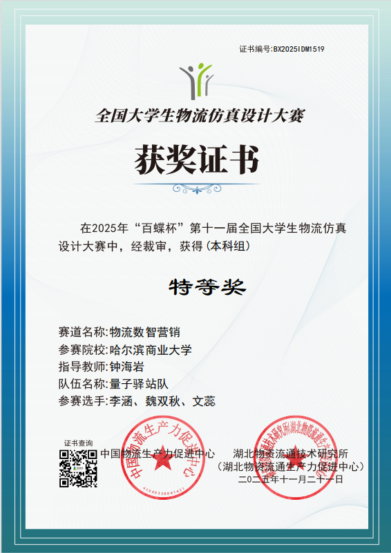管理学院2023级物流工程专业的两支队伍在此次赛事中表现突出,由教师钟海岩指导的“量子驿站队”在“物流数智营销”赛道斩获本科组特等奖,教师刘莉指导的“超级无敌队”在“物流中心规划与运营”赛道荣获本科组一等奖。两支队伍赛前不断打磨方案,将物流理论与仿真实践深度结合,凭借扎实的专业知识积累与创新的设计思路脱颖而出。