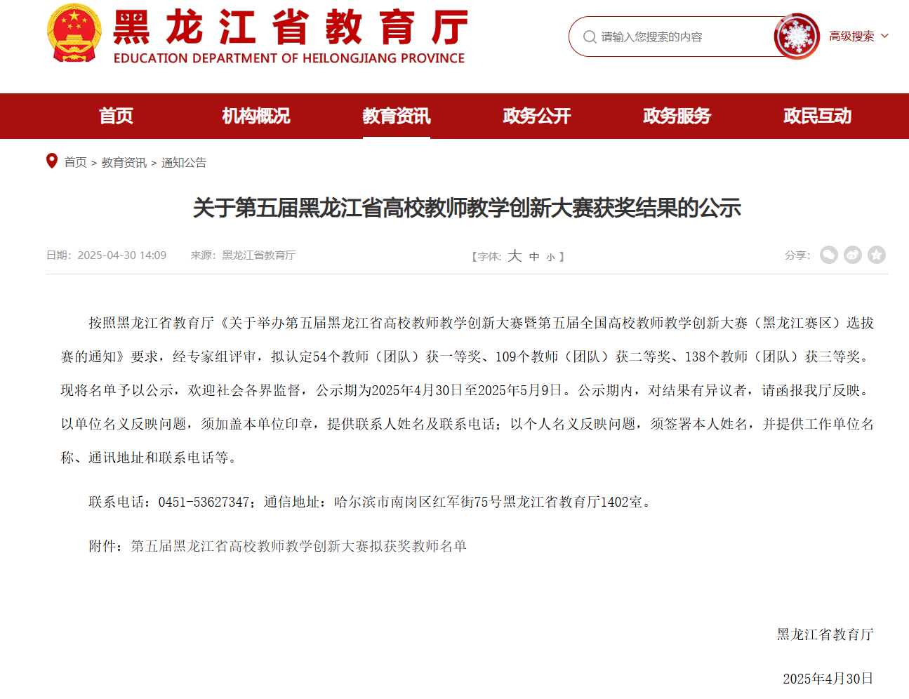 第五届黑龙江省高校教学创新大赛紧扣“推动教学创新 培养一流人才”的大赛主题,聚焦教育教学创新,推动高等教育高质量发展,设置新工科、新医科、新农科、新文科、基础课程、课程思政、产教融合、新教师等8个赛道,实行校赛、省赛、国赛的三级赛制,分网络评审和现场比赛两个阶段。全省39所本科高校共有559位教师(团队)参赛,经过激烈角逐,共评选出一等奖54项、二等奖109项、三等奖138项。