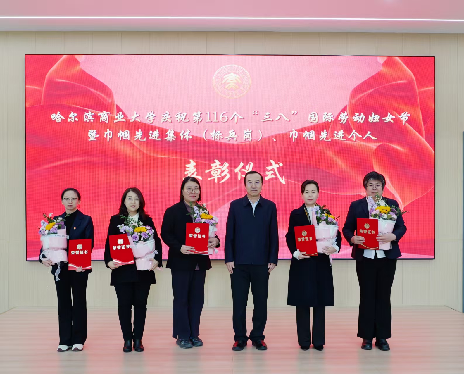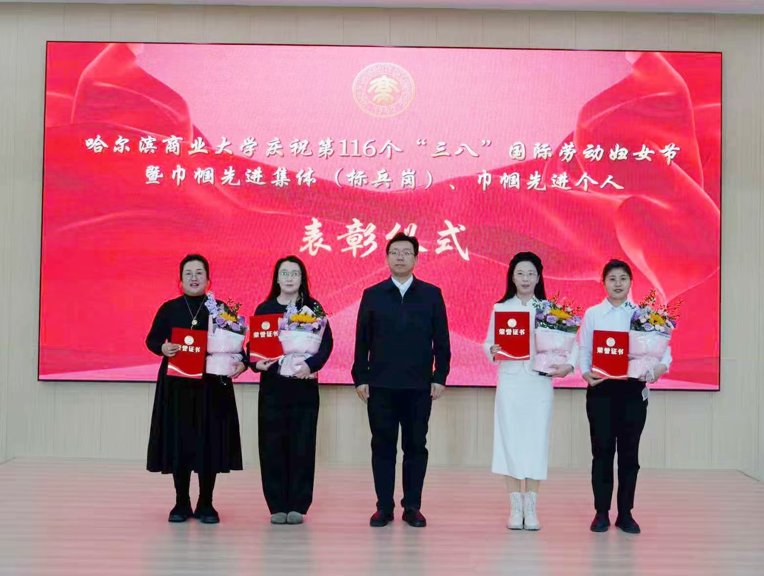 会议对2025、2026年“三八”红旗集体(标兵岗)、杰出巾帼工作者进行了表彰,校领导为获奖集体和个人颁发荣誉奖牌和证书,向全校广大女教职工致以节日的美好祝福和诚挚问候,并充分肯定了全校女教职工在教学科研、人才培养、管理服务、校园建设等各项工作中发挥的重要作用、作出的突出贡献。长期以来,我校广大女教职工以高度的责任感和使命感,立足本职、深耕细作,敬业奉献、锐意进取,以巾帼不让须眉的昂扬姿态,在立德树人一线坚守初心,在事业发展征程中勇毅前行,生动展现了新时代商大女性自尊自信、自立自强的精神风貌,为学校高质量发展撑起了“半边天”。