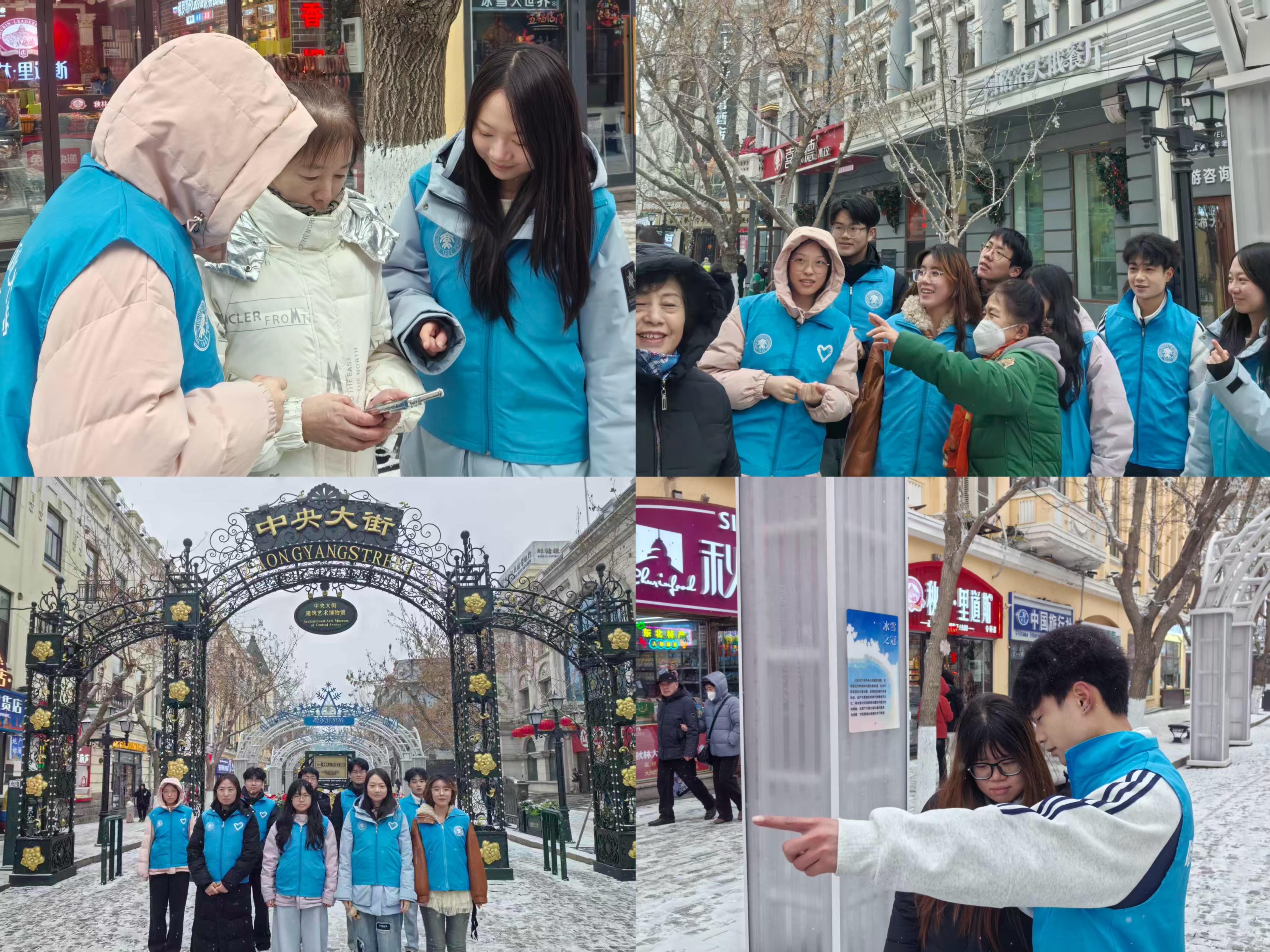 志愿“冰城”行,温情暖老街。在中央大街景区,志愿者们化身“城市讲解员”和“贴心向导”,为游客提供义务讲解与引导服务,传递哈尔滨的历史文化,展现龙江青年的文明风貌。