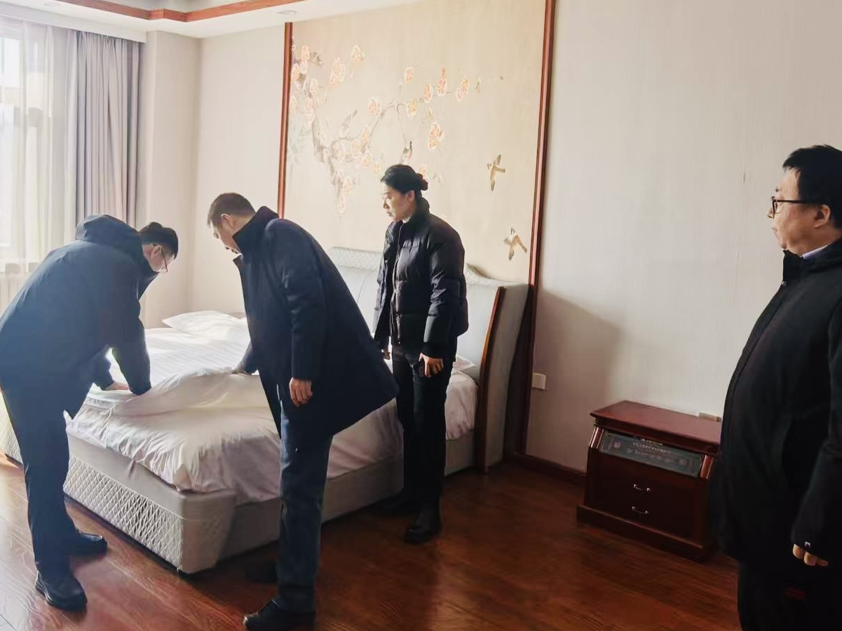 本次调研检查采取“实地察看+现场问询+细节核查”的方式,聚焦学术交流中心运营服务与安全管理关键环节,检查组先后深入餐厅、厨房、员工休息室、客房、布草间、防火通道等重点区域开展全方位、多角度的细致排查。在餐厅与厨房区域,重点核查食品安全管理制度落实、食材储存条件、操作流程规范及环境卫生状况等情况,详细询问菜品供应种类、营养搭配方案及各类接待保障能力,要求严把食品安全关,夯实餐饮服务基础;在员工休息室,欧忠辉与相关负责人深入交流,关切了解员工生活条件保障情况,强调要切实保障员工合法权益,用心解决员工工作生活中的实际问题,为员工安心工作解除后顾之忧;在客房与布草间,仔细查验房间设施设备维护、卫生清洁执行标准、布草消毒全流程及物资管理规范等细节,反复强调要始终坚守“安全、舒适、卫生”的核心服务标准,持续提升住宿服务品质;在防火通道,重点核查通道畅通情况、消防设施配备与完好性、应急照明及疏散指示标识设置等消防安全关键要点,要求相关负责人时刻绷紧安全生产之弦,从严从实筑牢消防安全防线。