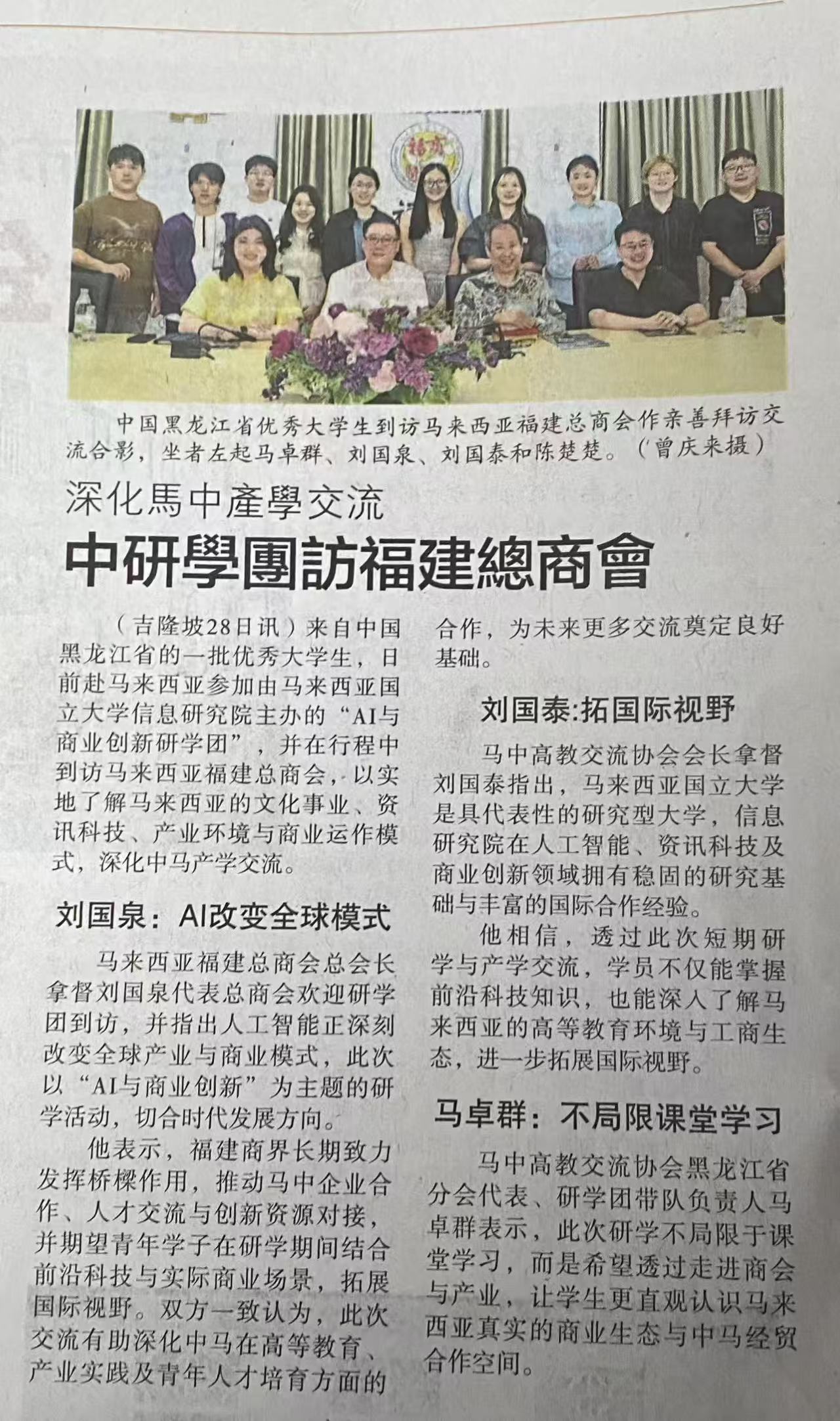 在马来西亚国立大学,同学们参加了“AI 与商业创新”研学营,围绕AI时代背景下商业创新主题展开深入学习和讨论,并到访了马来西亚福建总商会,相关活动获得马来西亚华文媒体《星洲日报》的报道。