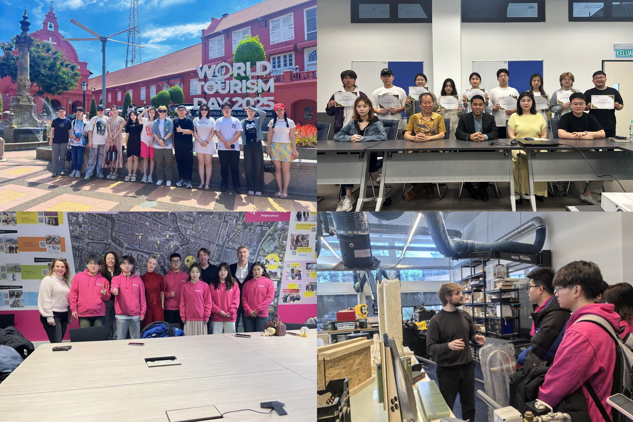 在英荷应用科技大学,同学们参加了一系列学习与实践活动,包括商业课程讲座、先进制造实验室参观、兴趣小组互动、商业课程研习、工程实践操作、中荷文化交流,以及阿姆斯特丹当地人文景观探访等多个环节。