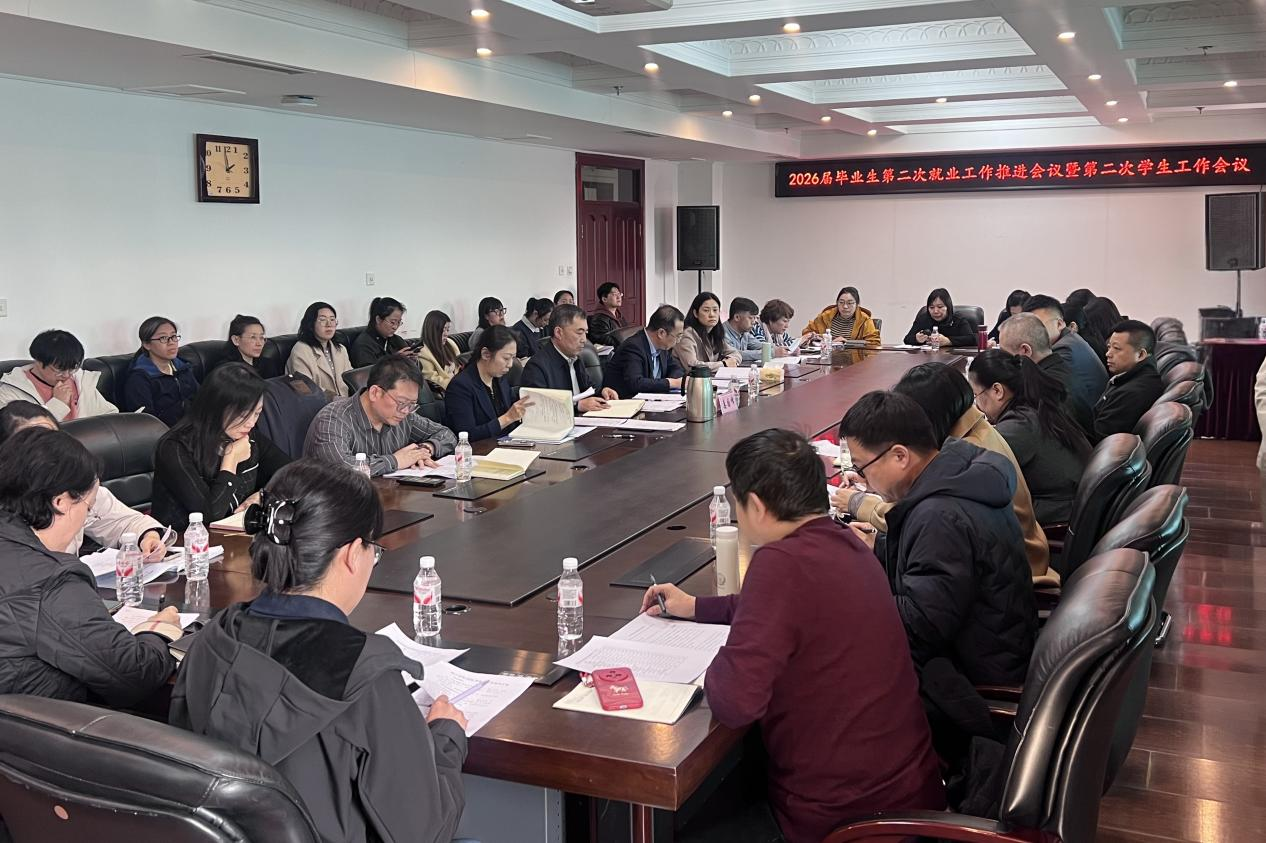 为深入贯彻落实省教育厅《关于开展2026届高校毕业生“春季促就业攻坚行动”的通知》要求,扎实推进2026届毕业生就业工作,全面提升学生工作质量,4月2日下午,我校在行政楼五楼会议室召开2026届毕业生第二次就业工作推进会议暨第二次学生工作会议。校党委副书记姜国峰出席会议。各学院党委(党总支)书记、副书记,全体毕业班辅导员及大学生就业创业指导中心全体工作人员参加会议。