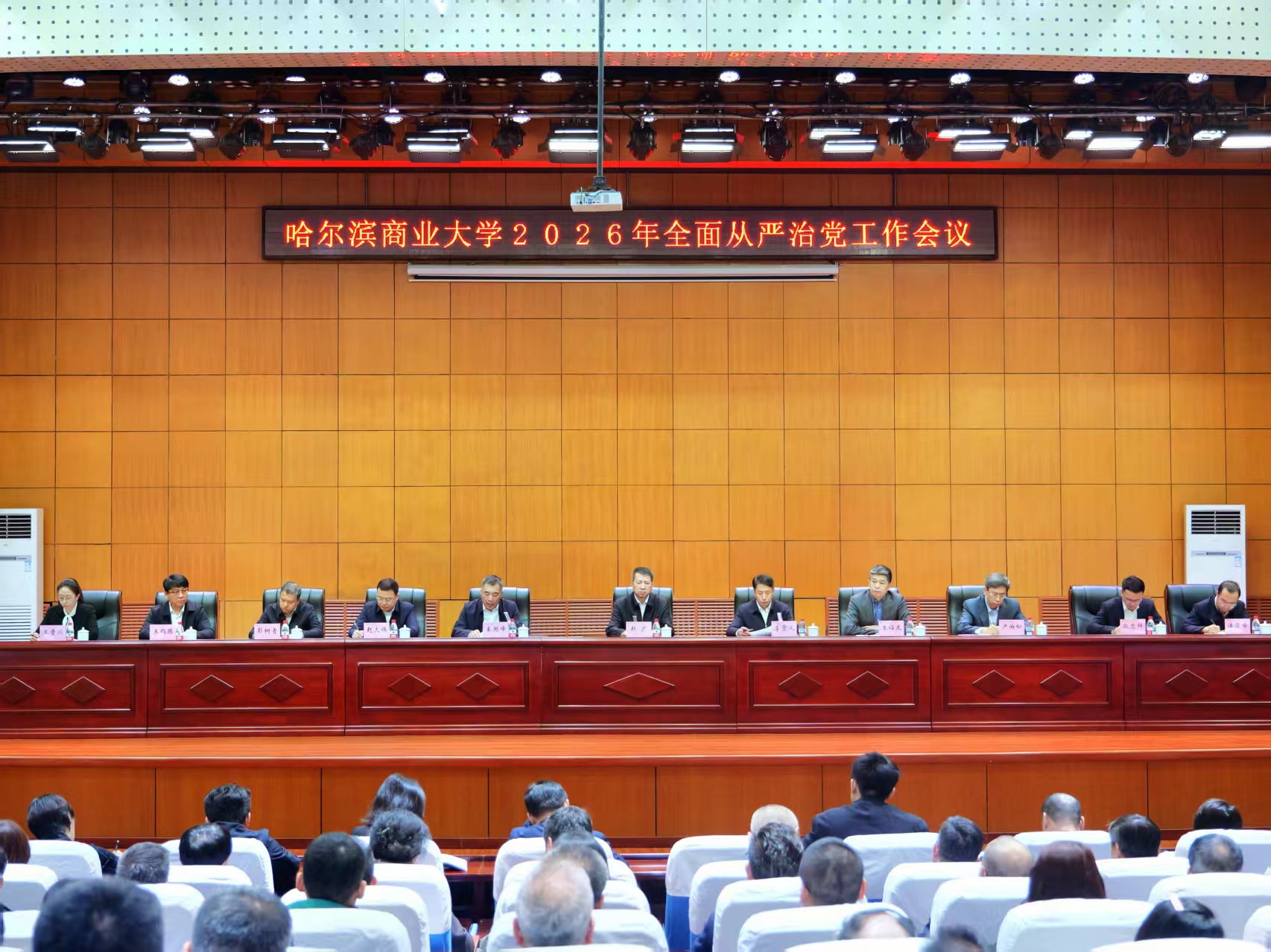 4月16日,2026年全面从严治党工作会议在国际报告厅召开。校领导,校长助理,党委常委、组织部部长、宣传部部长、统战部部长,副处级及以上干部,各基层纪委书记(纪检委员),教工党支部纪检委员,纪委办公室全体工作人员参加会议。校党委副书记、工会主席姜国峰主持会议。