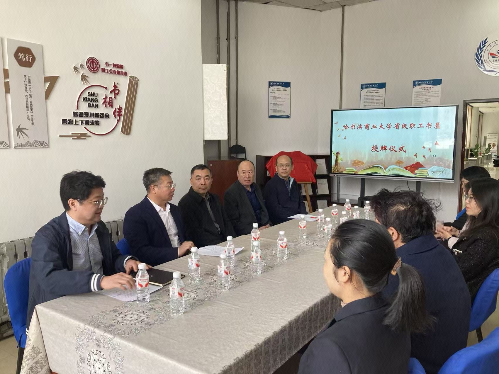 我校省级职工书屋揭牌仪式暨“书香‘尔滨’忆过往 文脉传承润师心”世界读书日主题读书交流活动在图书馆职工书屋举办。校党委副书记、工会主席姜国峰,工会常务副主席周鸿武,图书馆与网络教育技术中心联合党总支书记李建军,工会副主席李美杰,图书馆副馆长铁峰及教职工读书协会会员参加活动。活动由工会副主席王云松主持。