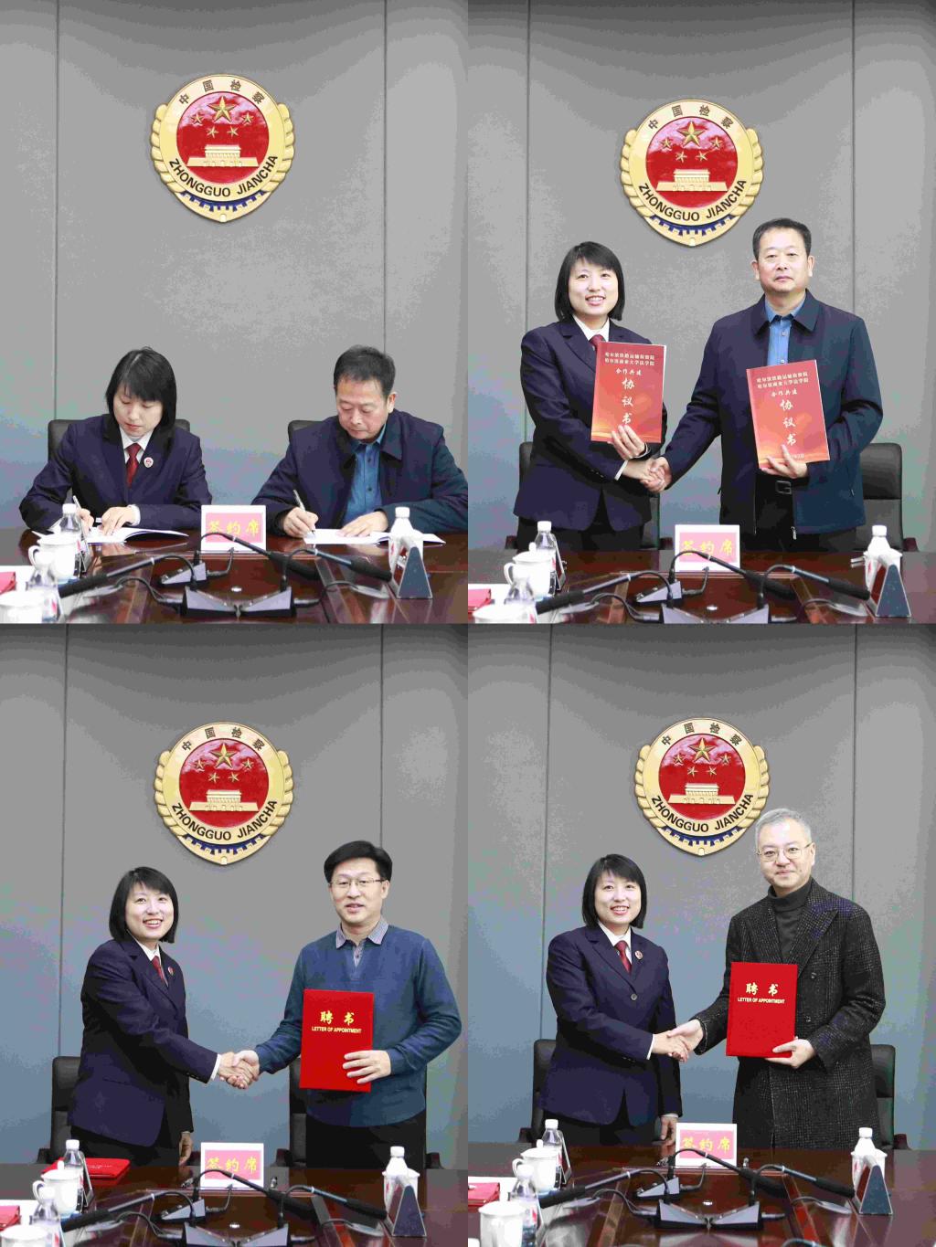 签约仪式开始前,双方代表就如何深入开展检校合作,充分发挥各自优势促进资源共享、搭建法治实践与法学教育深度交融平台,共同推动检察事业与法学教育事业协同高质量发展进行了交流,形成了一致意见。签约仪式上,我校法学院院长高勇与哈尔滨铁路运输检察院检察长胡丽丽共同签署了《检院合作共建协议书》,并互颁荣誉聘书。哈尔滨铁路运输检察院聘任三名我校法学院教授为该院法学理论基础与课题研究客座研究员,我校法学院聘任哈尔滨铁路运输检察院三名资深检察官为法律实践指导教师。胡丽丽检察长、高勇院长分别为受聘教师、受聘检察官颁发聘书。