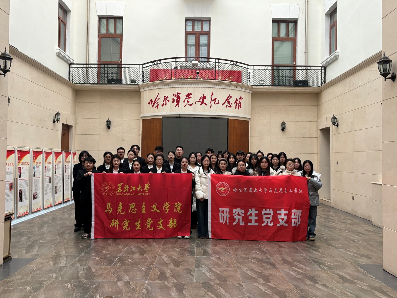 为深入学习贯彻党的二十届四中全会精神,进一步加强基层党支部建设,夯实党支部结对共建工作基础,增强基层党组织的凝聚力,近日,哈尔滨商业大学马克思主义学院马克思主义基本原理教研室党支部和研究生党支部与黑龙江大学马克思主义学院教工第三党支部和第一学生党支部联合共赴哈尔滨党史纪念馆开展“校际联动聚合力 马院共建谱新篇”主题党日暨红色研学活动。哈尔滨商业大学马克思主义学院马克思主义基本原理教研室党支部书记张薇、黑龙江大学马克思主义学院教工第三党支部书记孙建茵以及党支部全体师生参加共建活动。