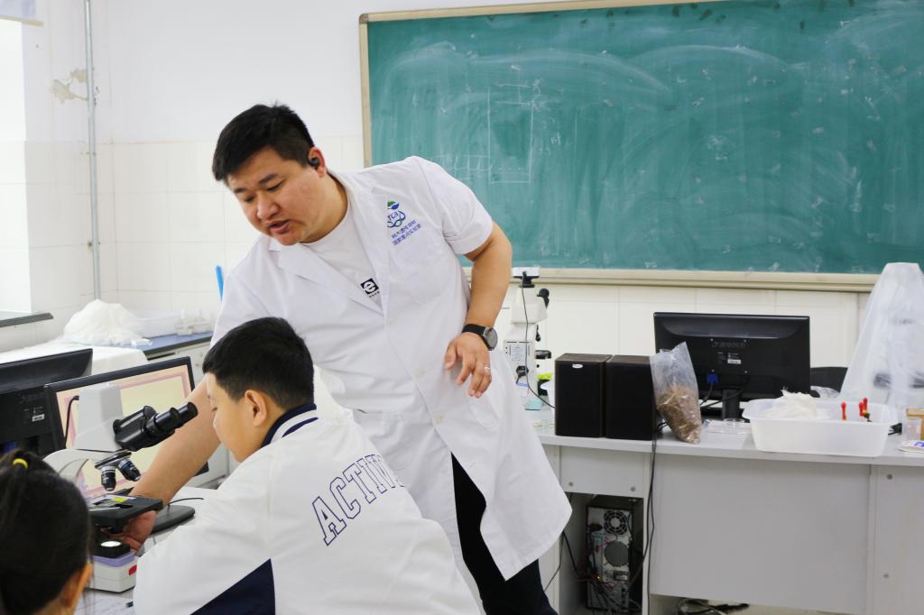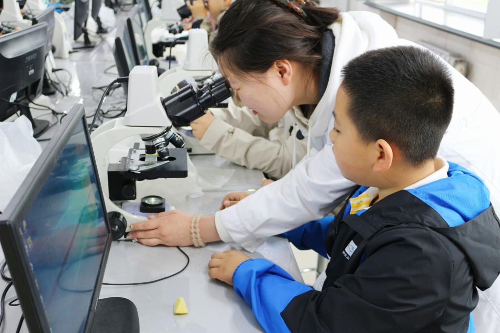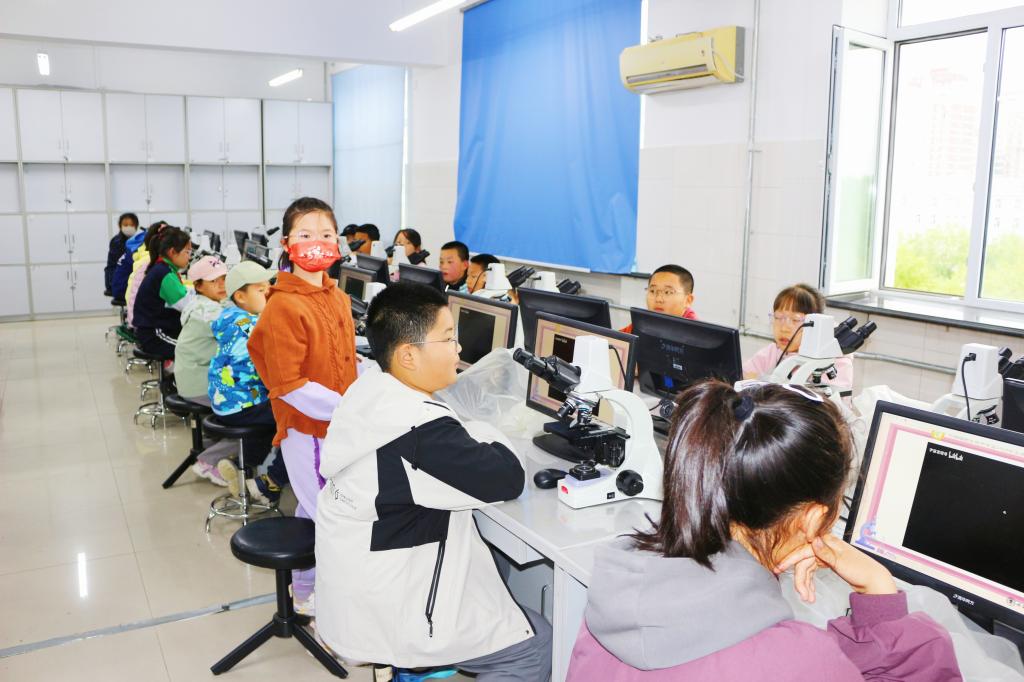 在多媒体显微互动教学实验室,赵世成老师和志愿者们手把手指导孩子们制作土豆、洋葱临时装片,通过数码显微镜观察植物细胞。“同学们看,这些排列整齐的细胞壁,就像我们团结一心的集体;叶绿体的运动,正是生命活力的体现。”通过将细胞结构与团队精神巧妙结合,让微观世界的科学知识充满温度。