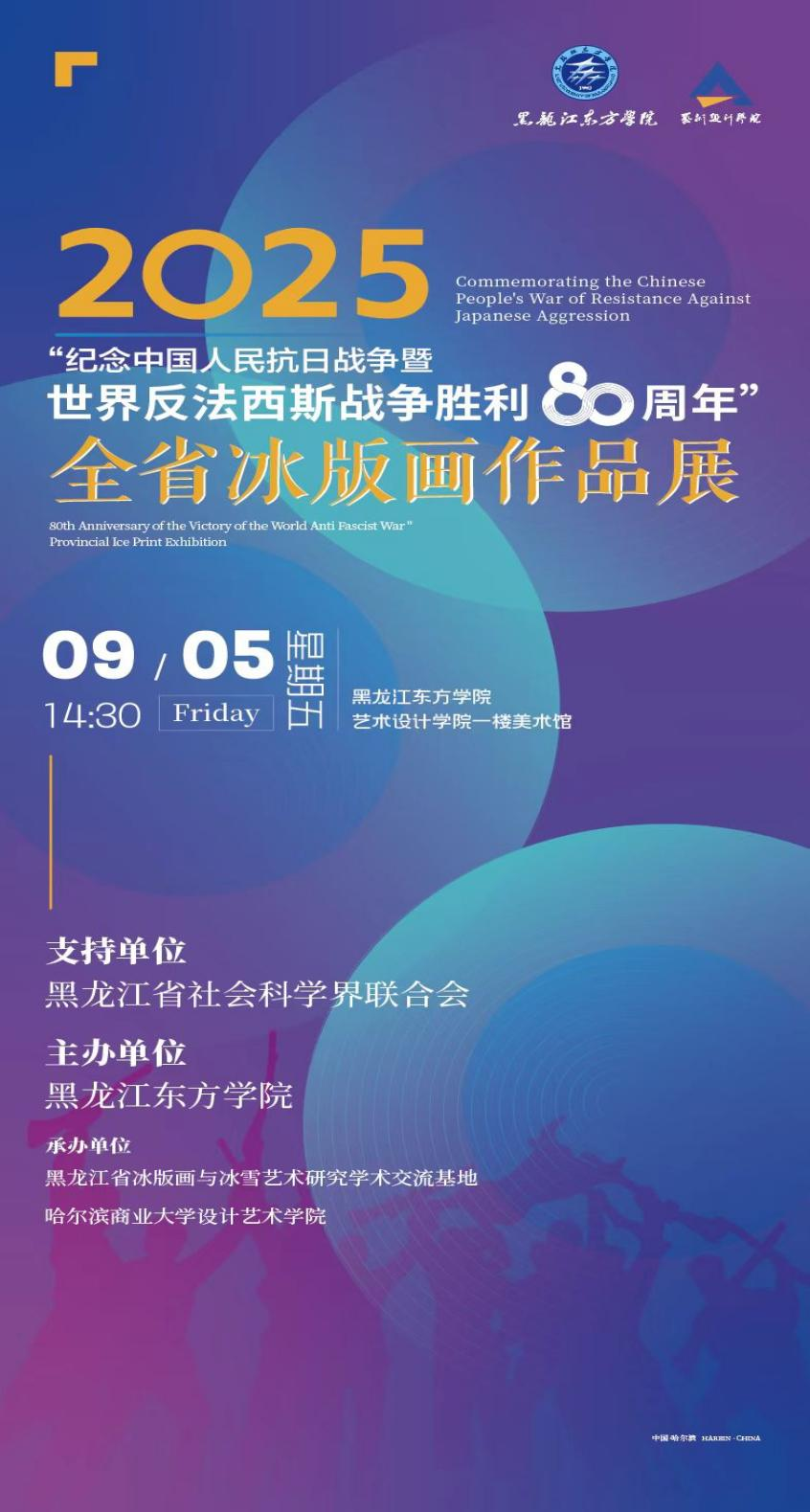 9月5日,由黑龙江省社科联支持、东方学院主办,我校设计艺术学院与黑龙江省冰版画与冰雪艺术研究学术交流基地联合承办的2025“纪念中国人民抗日战争暨世界反法西斯战争胜利 80 周年”全省冰版画作品展开幕式,在东方学院艺术设计学院一楼美术馆隆重举行。本次展览以93幅主题鲜明的冰版画作品为核心载体,通过艺术语言回望抗战历史、传承伟大精神,吸引政府代表、高校学者、艺术界专家等百余名嘉宾现场参与,成为全省纪念抗战胜利80周年系列活动中独具艺术特色的重要组成部分。