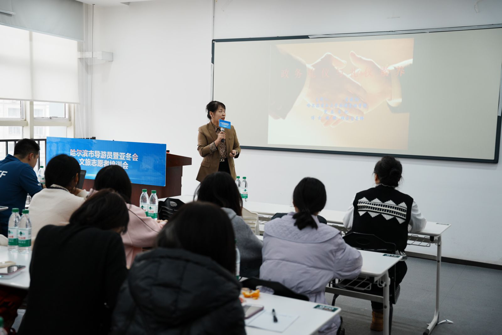 就认真落实好《黑龙江省旅游质量提升工作实施方案》《2024-2026黑龙江省冬季冰雪旅游“百日行动”实施方案》《哈尔滨市2024-2025冰雪季“百日行动”实施方案》等文件要求,围绕服务亚冬会,助力冰雪季,以增强“游客为本,服务至诚”的职业意识,规范提高旅游从业人员的专业素养,树立行业标杆,进一步提升城市美誉度,我校旅游烹饪学院(黑龙江省特色文旅工匠学院)协同其他单位共同承办了哈尔滨市导游员暨亚冬会文旅志愿者培训班。全市1000余名导游和文旅志愿者参加了培训,为哈尔滨冰雪旅游持续“出圈”提供人才保障和智力支撑。