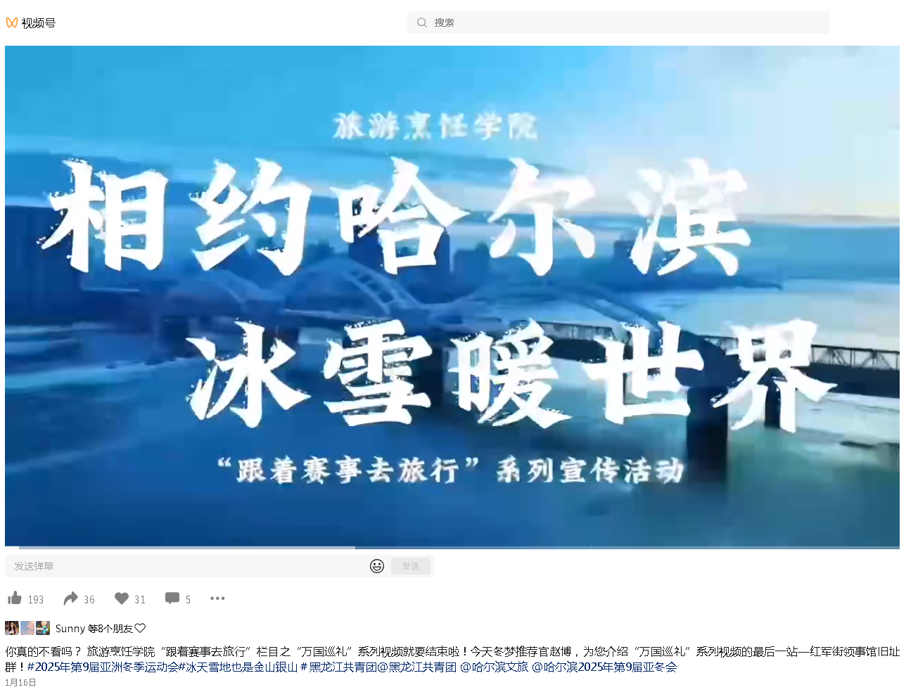 在近3个月的时间里,学院团委书记尚振华带领12名学生,制作了以“跟着赛事去旅行”哈尔滨景点系列宣传视频。团队根据哈尔滨文旅部门精心设计的12条精品旅游路线,共拍摄10部亚冬宣传片,涉及中央大街、中华巴洛克风情区、哈尔滨站、哈尔滨大剧院、领事馆旧址群、冰雪大世界等24处景点。从宁静秀美的自然景区,到底蕴深厚的文化古迹,从充满烟火气的特色街区,再到梦幻奇妙的童趣乐园,用镜头记录着哈尔滨的美景,用赤诚的爱做好哈尔滨文旅推荐官。系列宣传片发布后,引发热烈反响,累计播放量高达30000余次,点赞、评论与转发量也十分可观。网友们纷纷留言,称赞被片中呈现的城市风光深深吸引,对亚冬会的期待值直线拉满,也让更多人了解到双亚冬之城——哈尔滨的独特魅力。