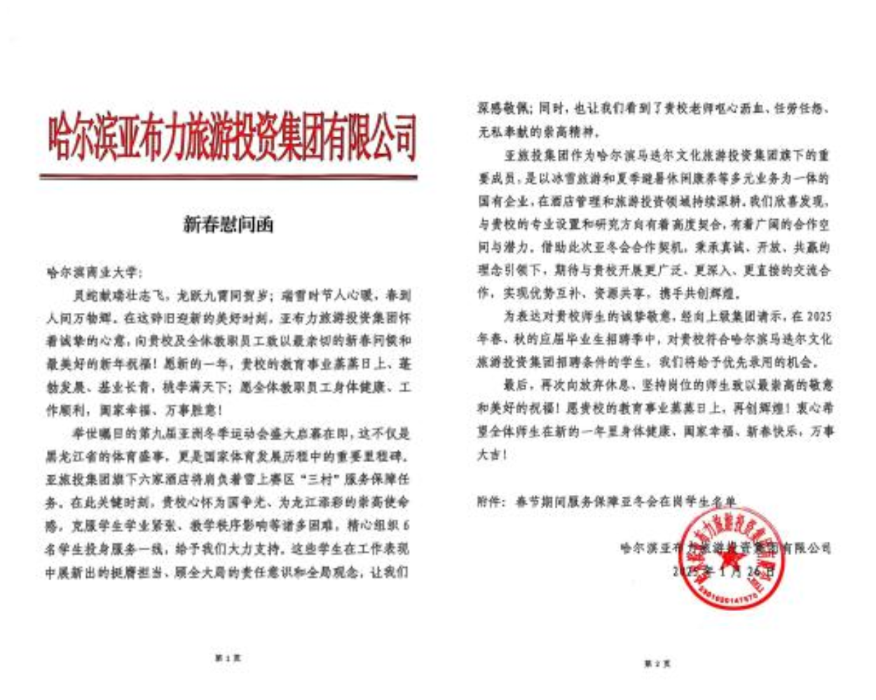 恰逢寒假,亚冬会的举办也为哈尔滨商业大学旅游烹饪学院的学生提供了非常难得的社会实践机会。旅游烹饪学院抓住契机,与亚冬会接待单位进行联络沟通,为学生创造社会实践机会,让学生充分利用好假期,在为亚冬会服务、为哈尔滨冰雪旅游服务的过程中不断提高自己理论联系实际的能力和水平。亚冬会期间,马迭尔集团承接亚旅投旗下四家酒店的亚冬会保障服务任务,劳模基地承接亚冬会接待任务,两家单位为了保证服务质量,急需一批高素质的员工。学院与企业积极配合,11名同学在上述单位顶岗实践。学院学生在工作中展现出了扎实的理论功底和良好的专业素养,马迭尔集团为此向学校发来感谢信。