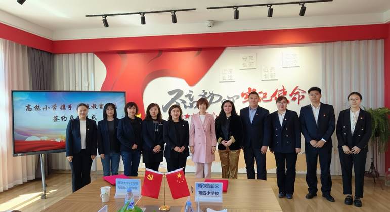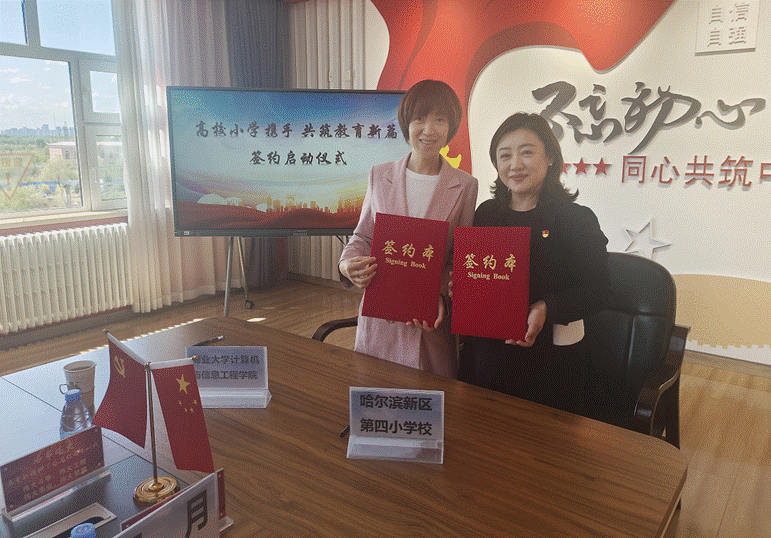 为深入贯彻落实习近平总书记关于教育的重要论述和全国教育大会精神,深化新时代“大中小学思想政治教育一体化建设”,探索“高校+小学”协同育人新模式,5月22日,哈尔滨商业大学计算机与信息工程学院与哈尔滨市新区第四小学举行“大中小学思想政治教育一体化建设”项目合作签约仪式。