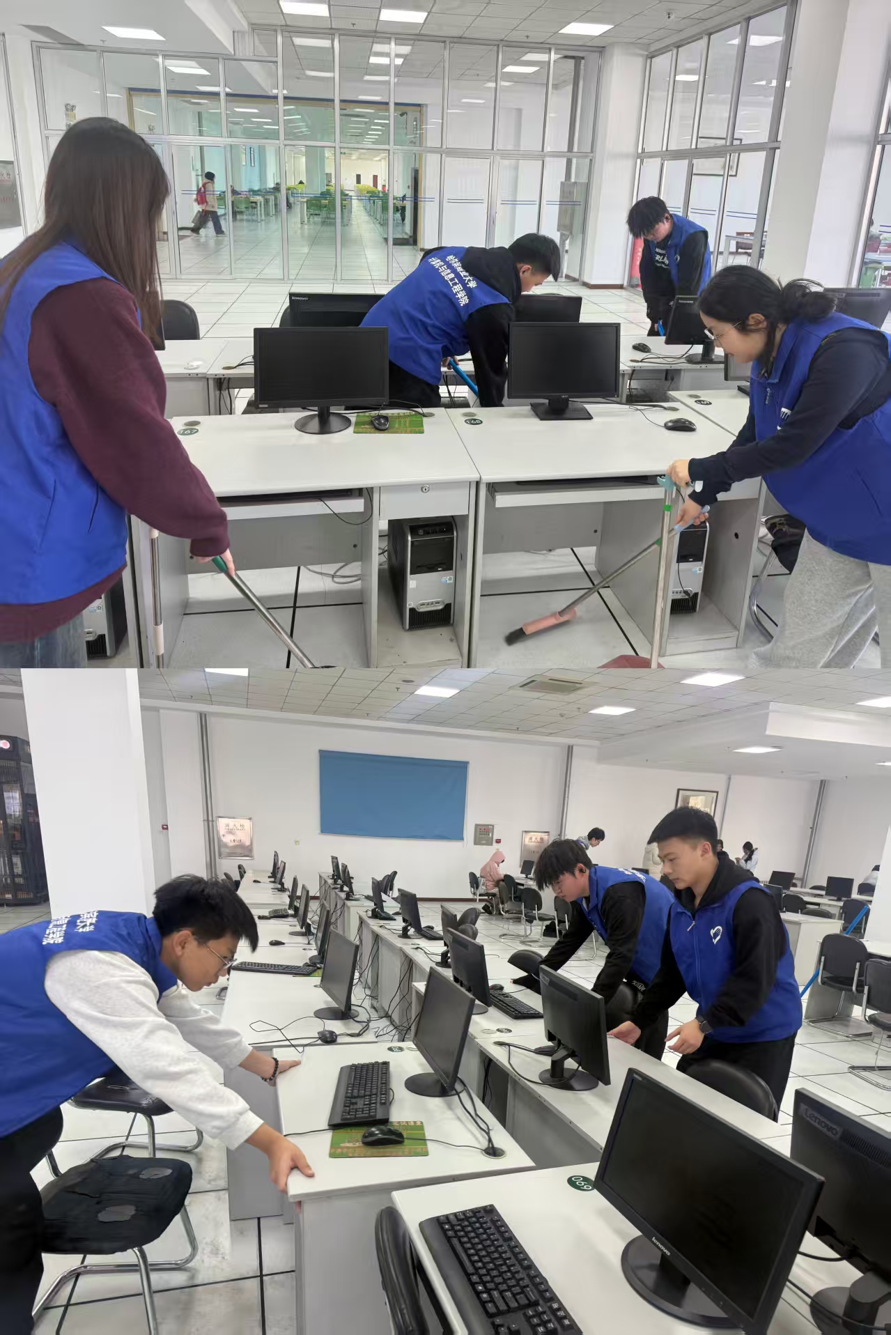 活动中,志愿者们统一着装、分工协作。大家首先带着清洁工具对图书馆电子阅览室的地面、书桌缝隙等公共区域进行全面清扫整理,不放过任何一处卫生死角,为每一位前往图书馆的师生提供良好的学习氛围和舒适的环境。结束了公共区域的打扫后,志愿者们将注意力聚焦到书桌上。大家认真擦拭电脑机箱、书桌、图书阅读窗台。电子阅览室变得窗明几净。最后,同学们对倾斜、歪倒的桌椅进行“军训”,将它们摆放整齐,方便师生们使用。志愿者们用汗水为师生营造了整洁、舒适的阅读环境,内心感到无比充实与自豪。