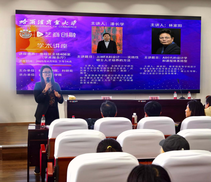 为持续深化干部能力作风建设,4月9日,“镜湖讲堂——艺商创融”活动在我校南校区主楼408报告厅举办。活动由研究生学院、科研处主办,设计艺术学院承办,邀请全国设计学研究生专业学位教学指导委员会委员、武汉理工大学潘长学教授,教育部高等学校设计学类专业教学指导委员会副主任、同济大学林家阳教授作专题讲座。设计艺术学院副院长丁凌云主持活动。设计艺术学院全体师生及业界代表聆听讲座。