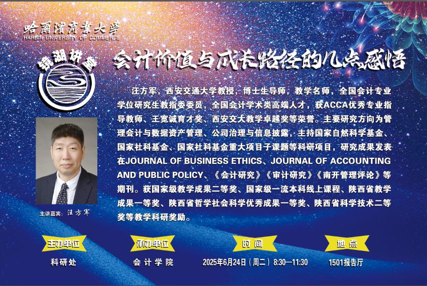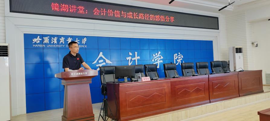 6月24日上午,哈尔滨商业大学“镜湖讲堂”在一号楼1501报告厅顺利举行。全国会计专业学位研究生教指委委员、西安交通大学汪方军教授带来《会计价值与成长路径的感悟分享》专题讲座。会计学院副院长姜雪松及学院师生代表参加讲座。讲座由姜雪松主持。