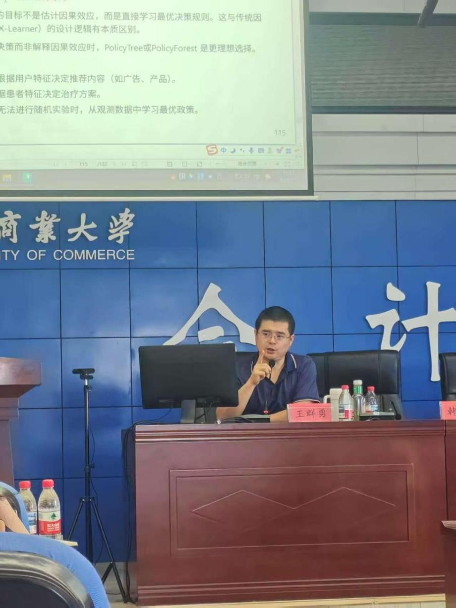 7月2日,哈尔滨商业大学“镜湖讲堂”专题讲座暨经济学院青年学者工作坊第一期在A区主楼1号楼1501报告厅顺利举办。南开大学数量经济研究所所长、中国数量经济学会常务理事、中国统计学会常务理事王群勇教授担任主讲嘉宾,围绕“机器学习因果推断:方法与应用”展开深入探讨,吸引了经济学院及校内相关学科师生积极参与。讲座由经济学院副院长韩朝亮教授主持。